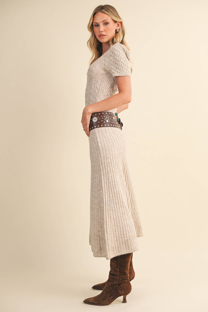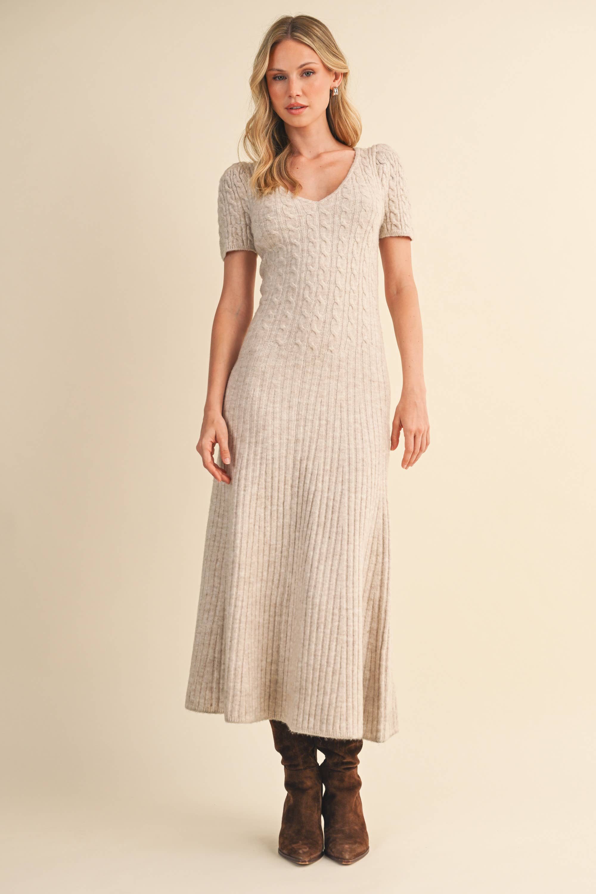 This cable-knit maxi dress brings a soft, cozy feel with an effortlessly feminine silhouette. The fitted bodice and flowing ribbed skirt make it perfect for fall outings, brunch dates, or everyday layering with boots.