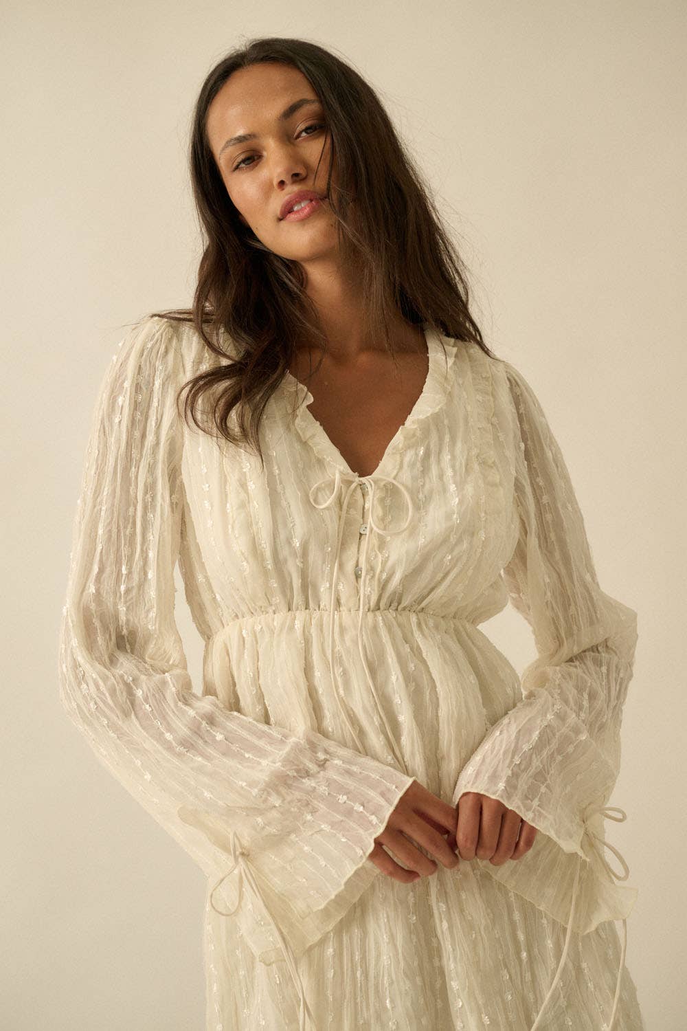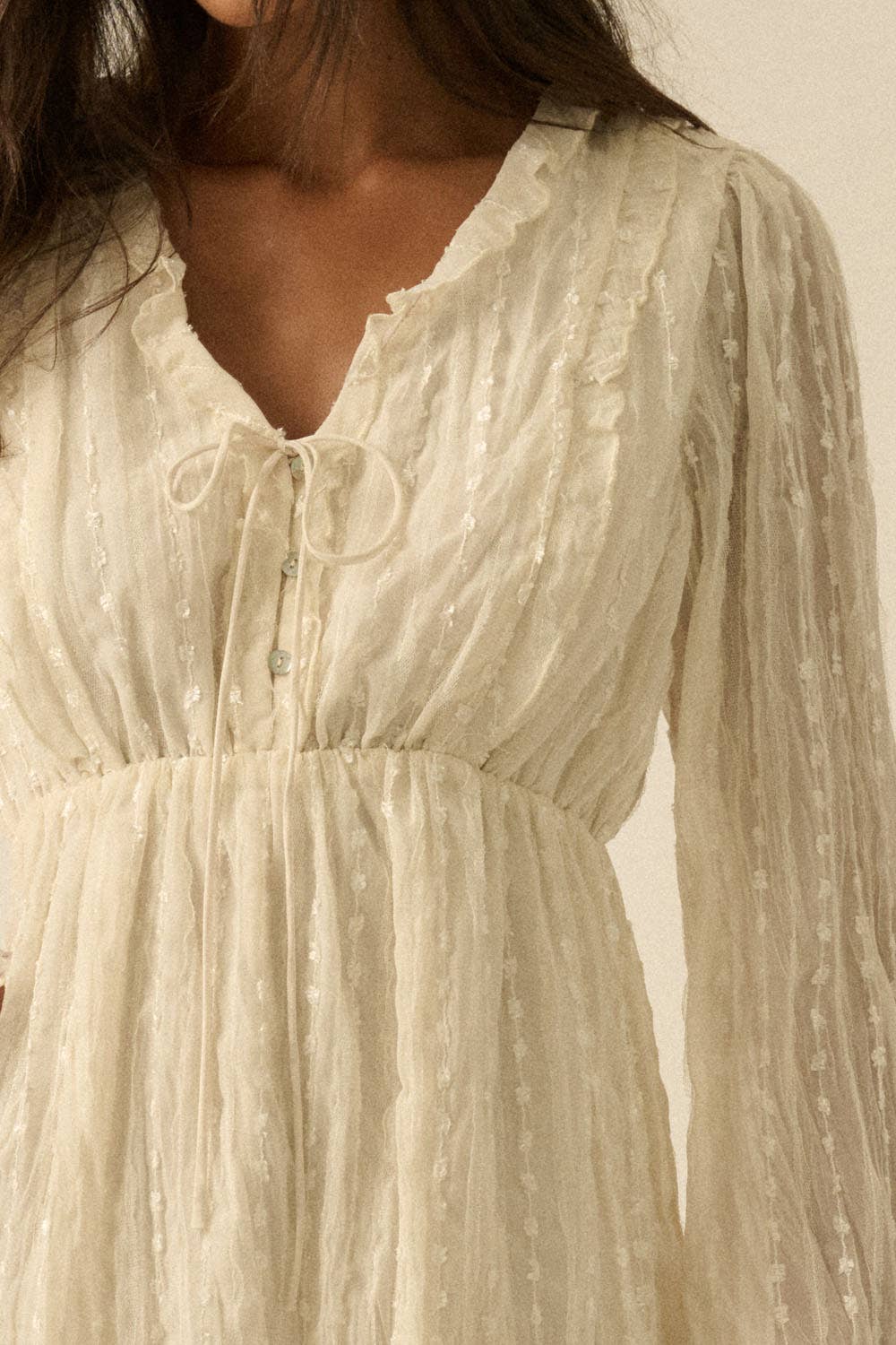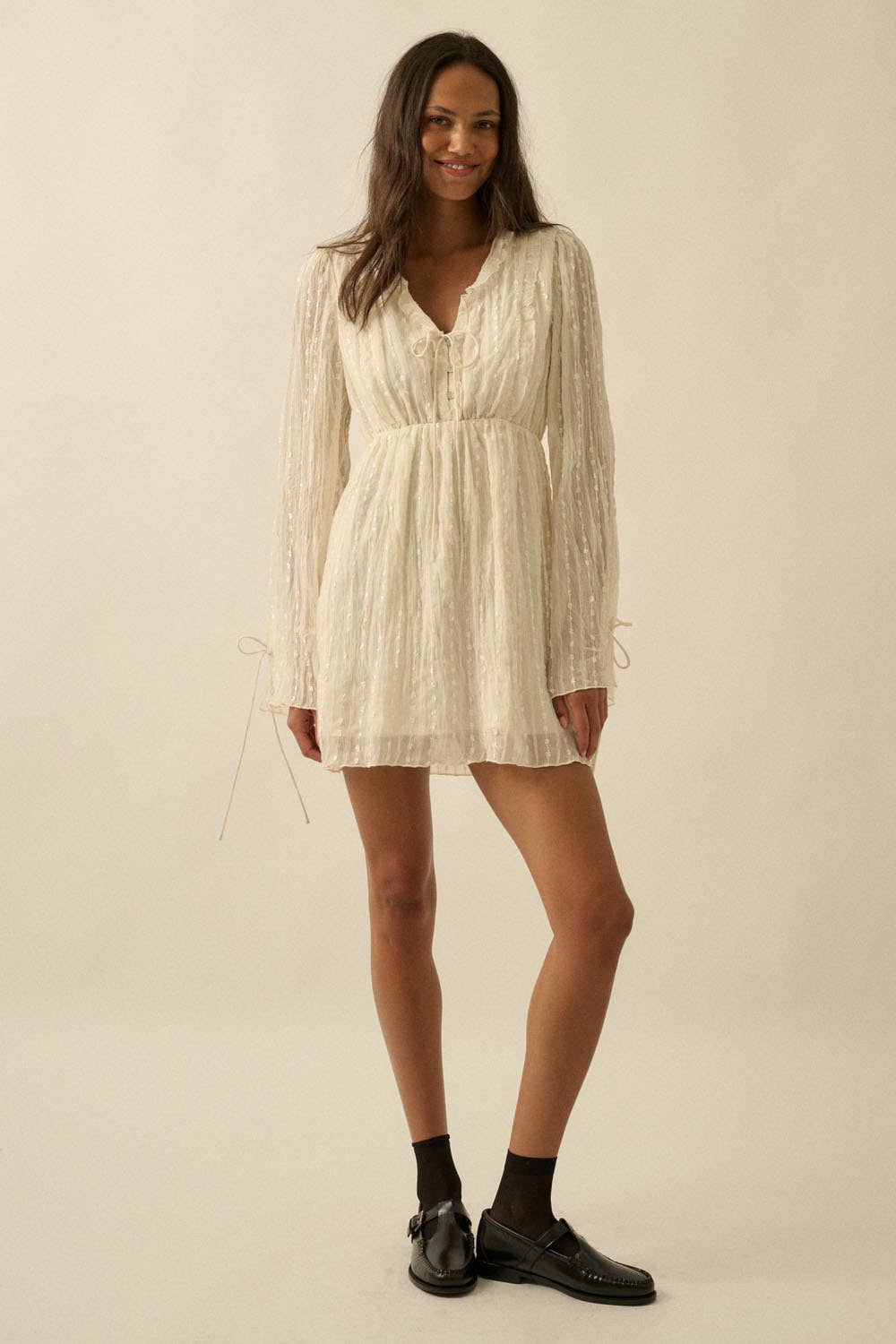 A cream mini dress featuring sheer long sleeves, subtle textured detailing, and a relaxed flowy silhouette. The delicate button-down front and tie accents make this dress effortlessly feminine, perfect for both casual days and evening outings.