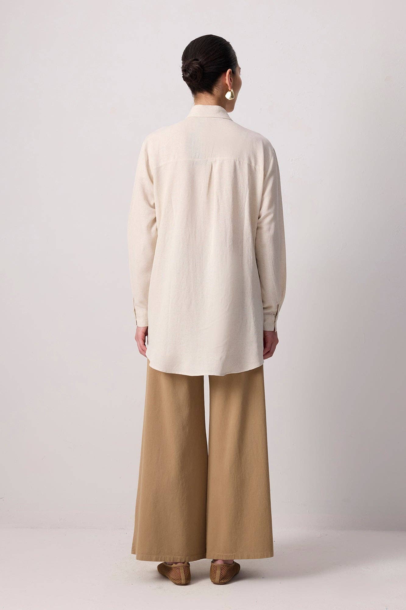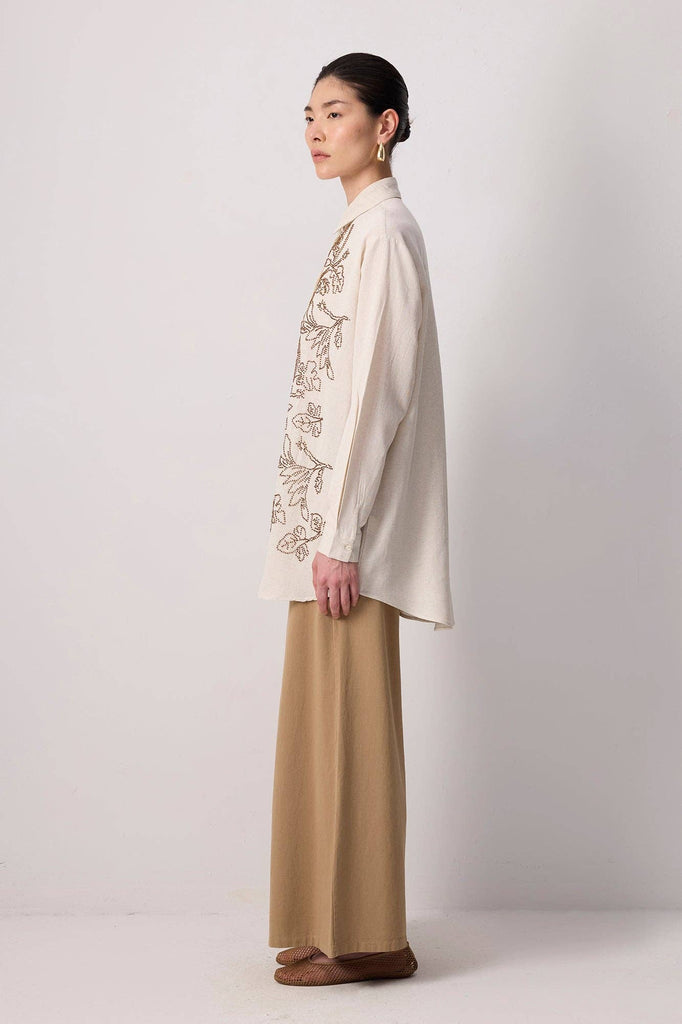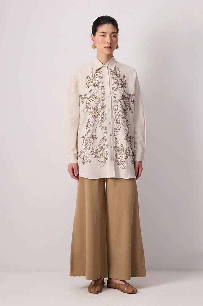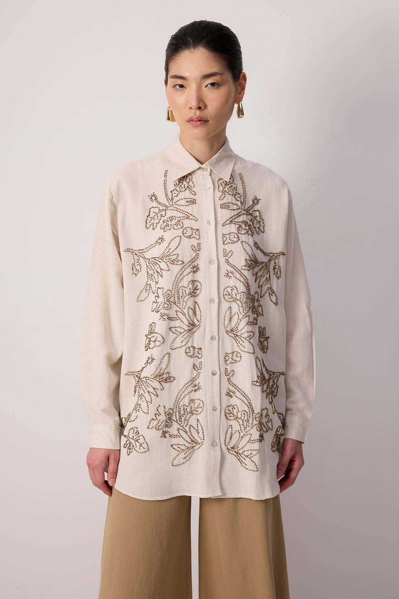 A relaxed button-up shirt in soft beige, detailed with delicate floral embroidery and intricate beadwork for subtle texture and charm. The perfect balance of casual elegance and handcrafted artistry.
