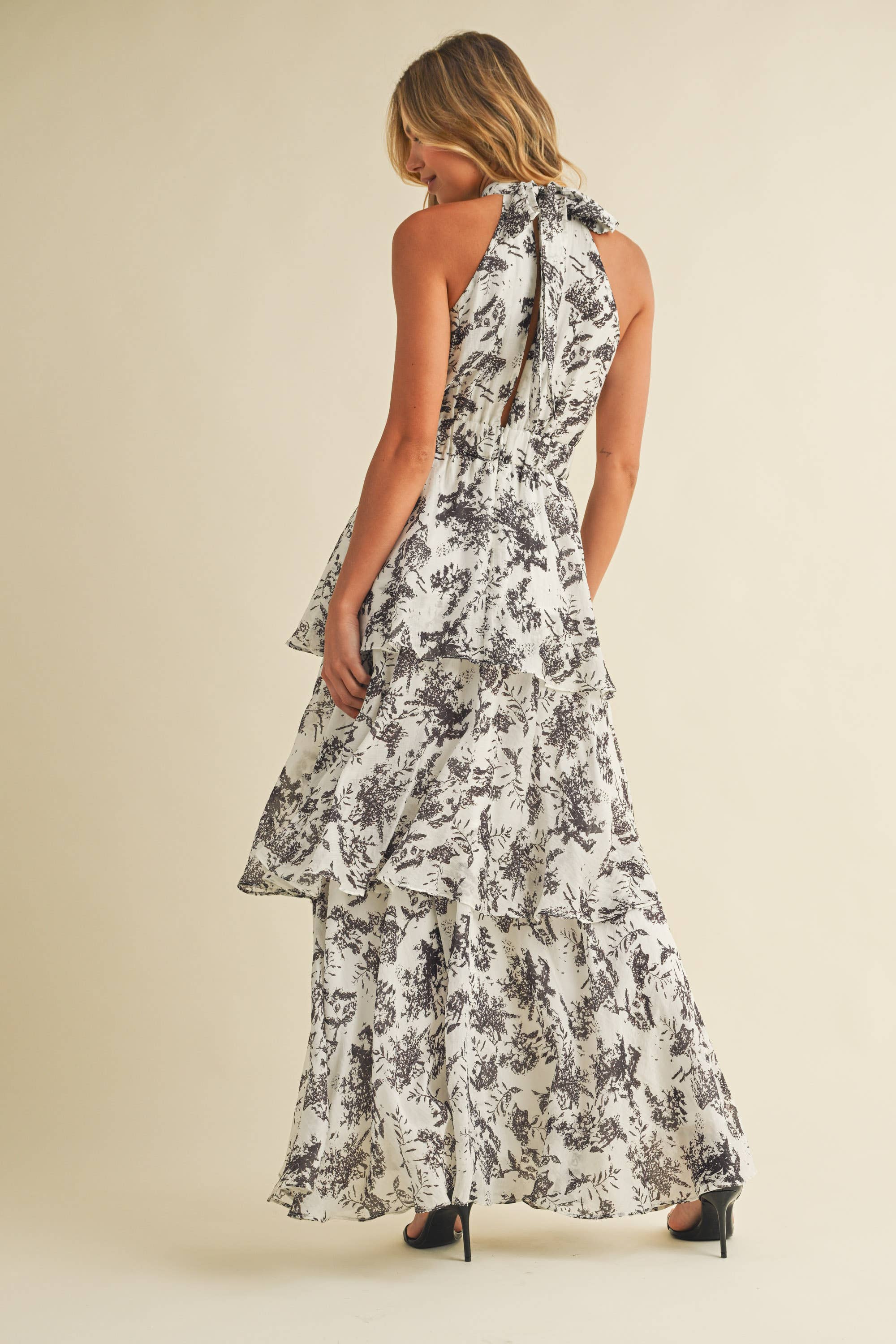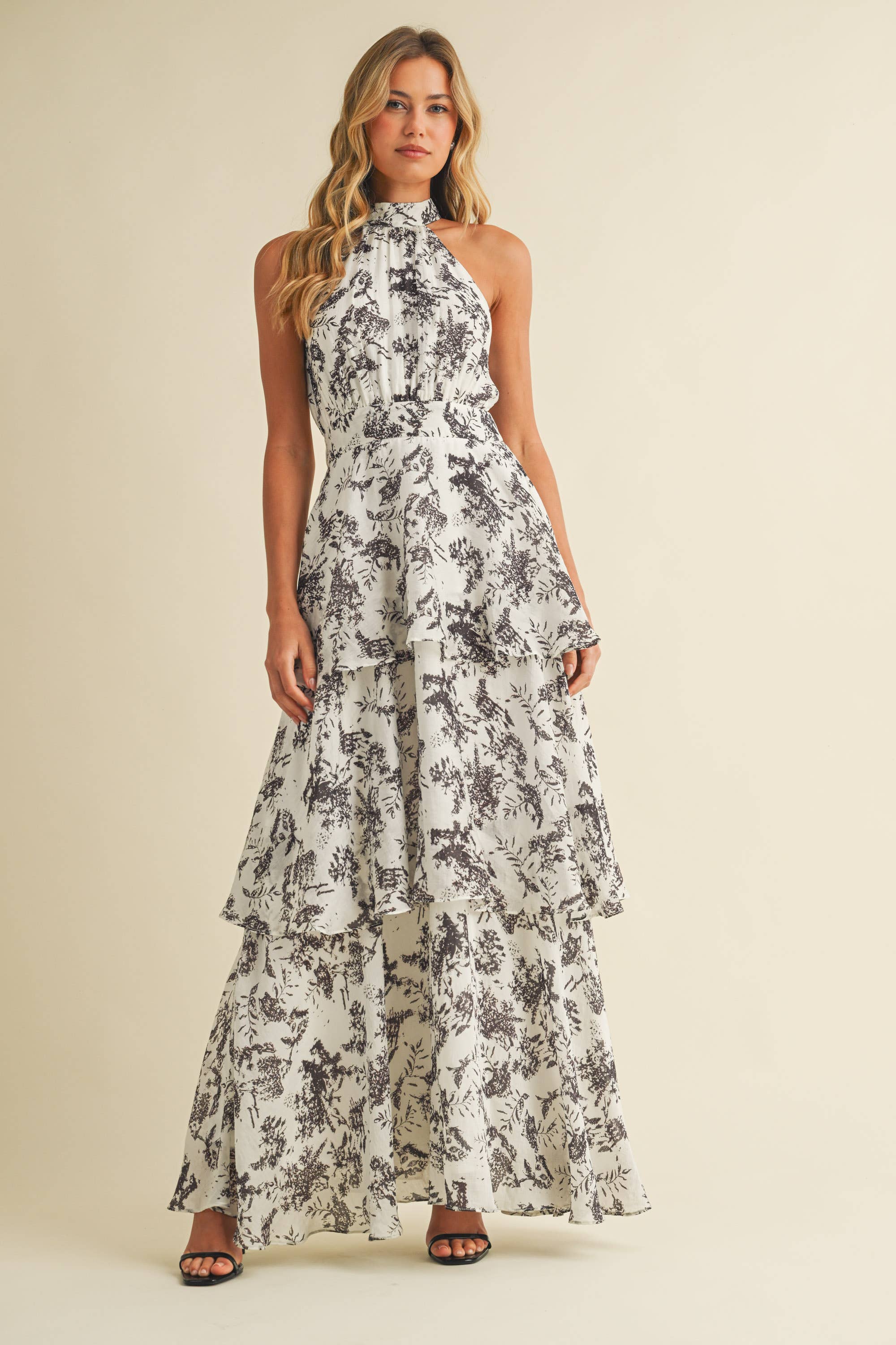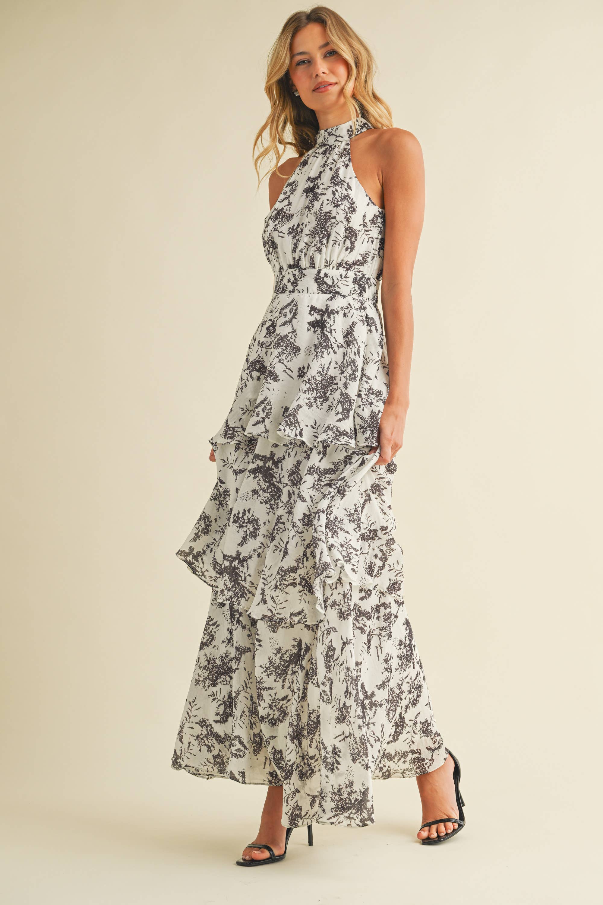 Elegant and breezy, this tiered maxi dress features a high halter neckline and a flattering fitted waist. The soft layered ruffles and toile-inspired print bring timeless charm to any garden party, wedding, or coastal getaway.