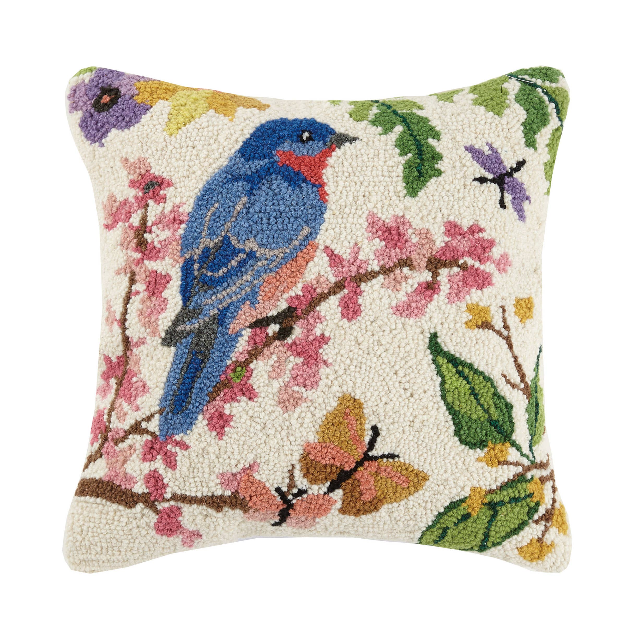 Bring nature indoors with this charming Bluebird Hook Pillow. Featuring a colorful bluebird perched on a branch surrounded by vibrant florals, this pillow adds a whimsical touch to any room. The intricate hooked design is crafted from soft wool, making it both a decorative and cozy accent for your sofa or bed.