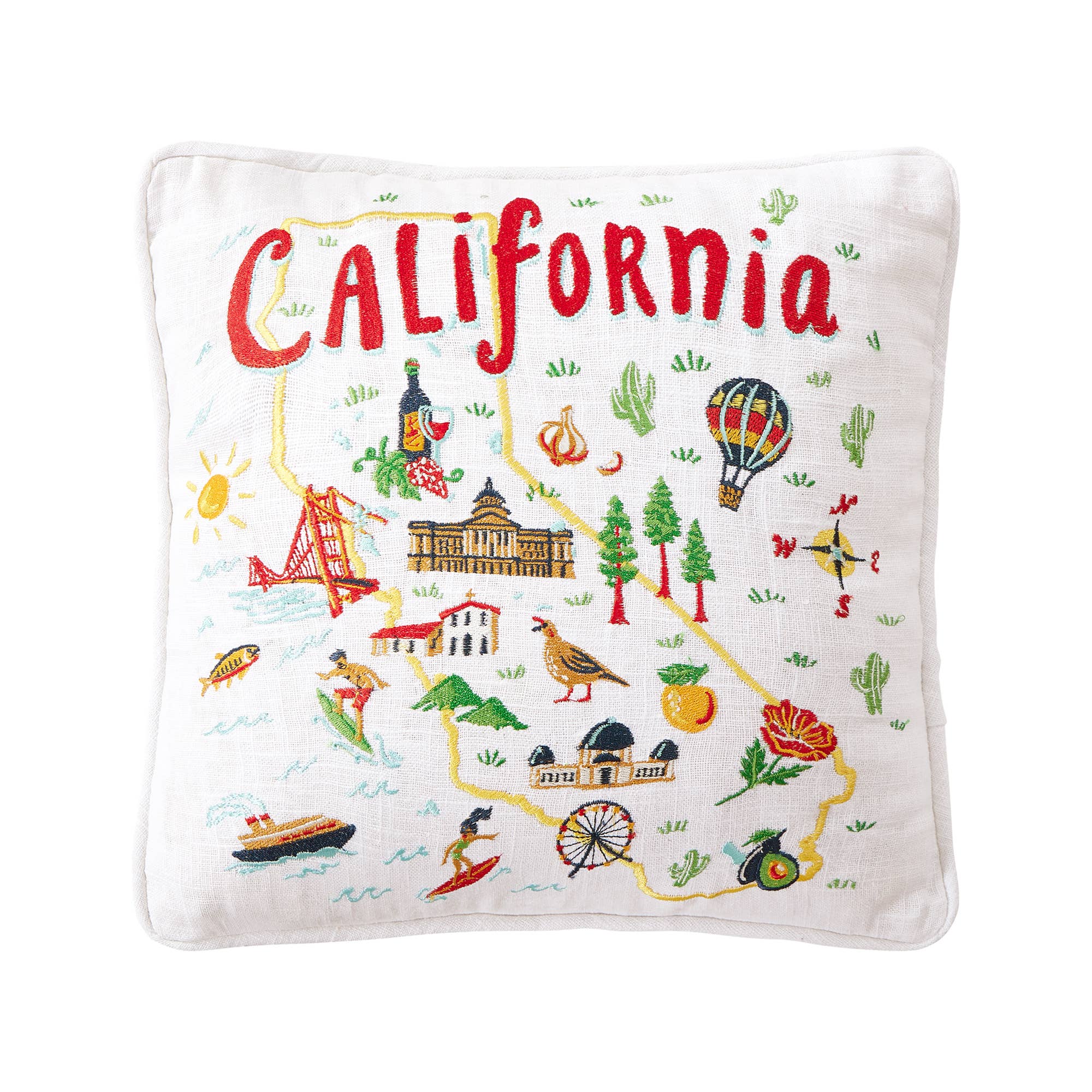 This California Embroidered Pillow captures the golden state's charm with vibrant threadwork showcasing iconic landmarks, local symbols, and sunny vibes. It's the perfect accent for adding a playful, West Coast touch to your home.