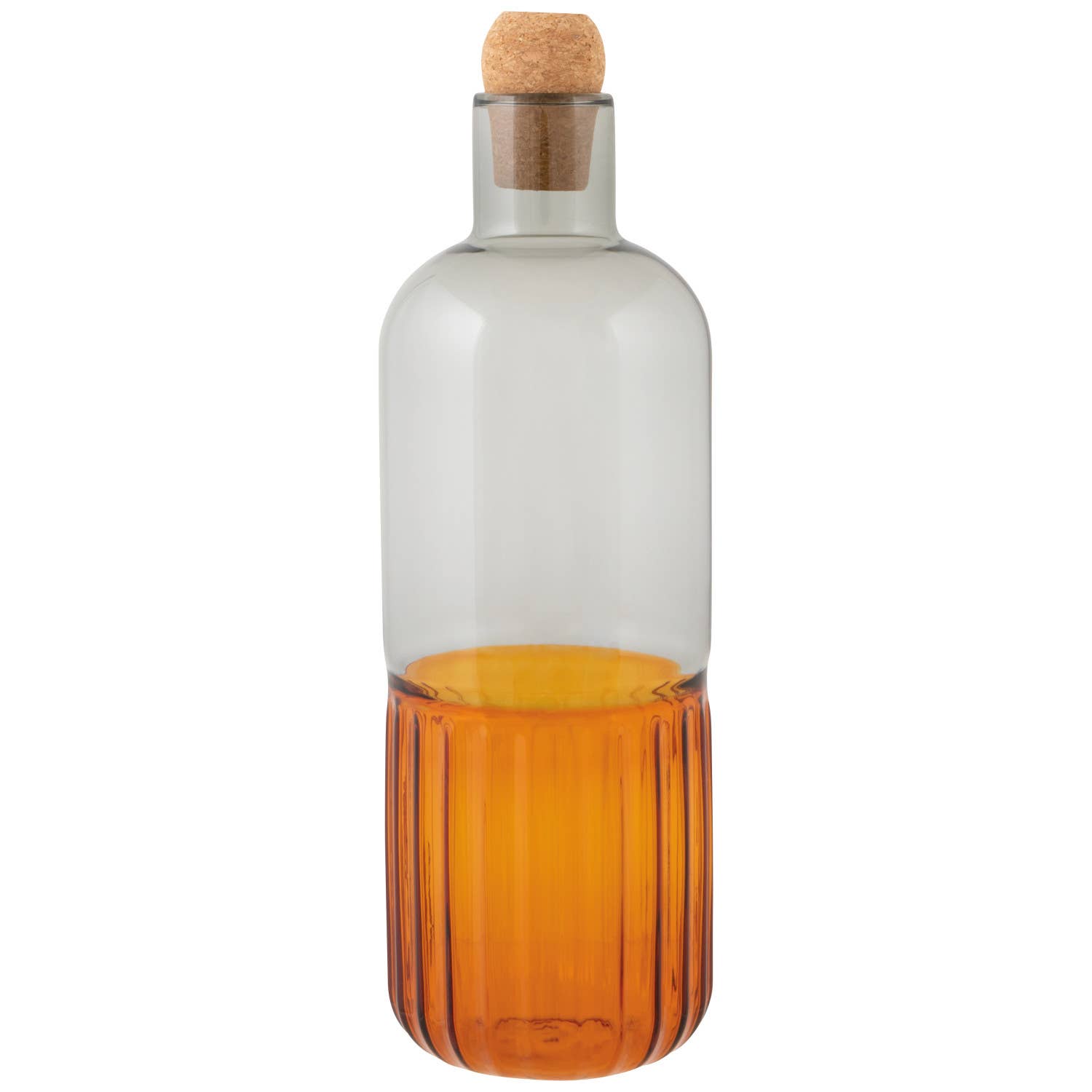 A modern glass bottle featuring a frosted upper half and a warm amber ribbed base, finished with a natural cork stopper. Stylish enough for countertop display and perfect for storing oils, syrups, or infused liquids.