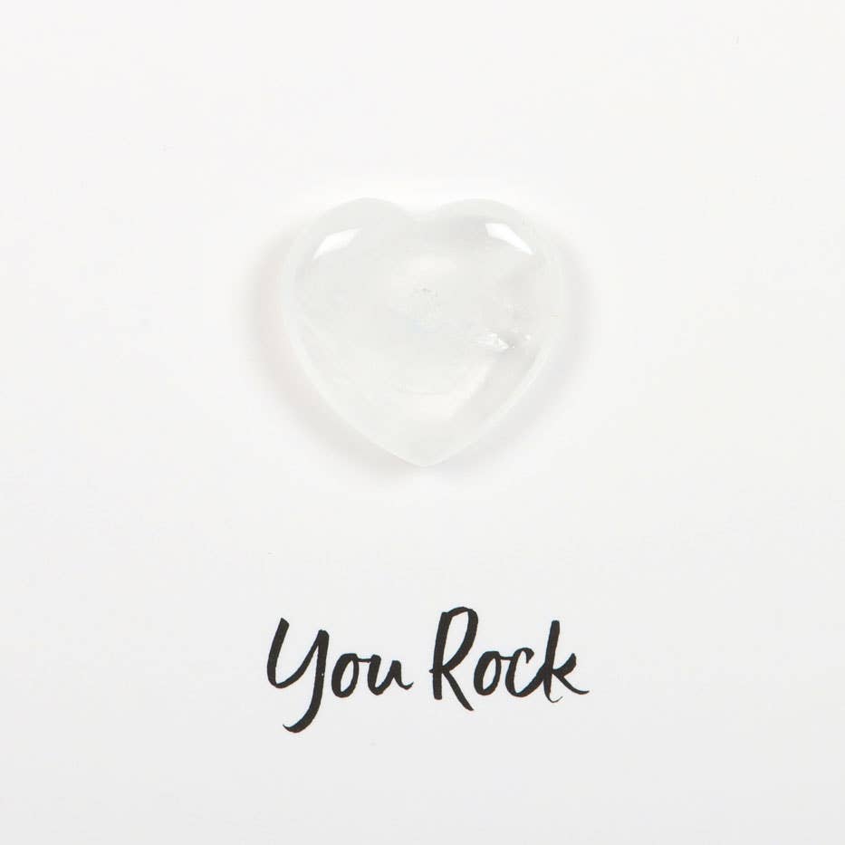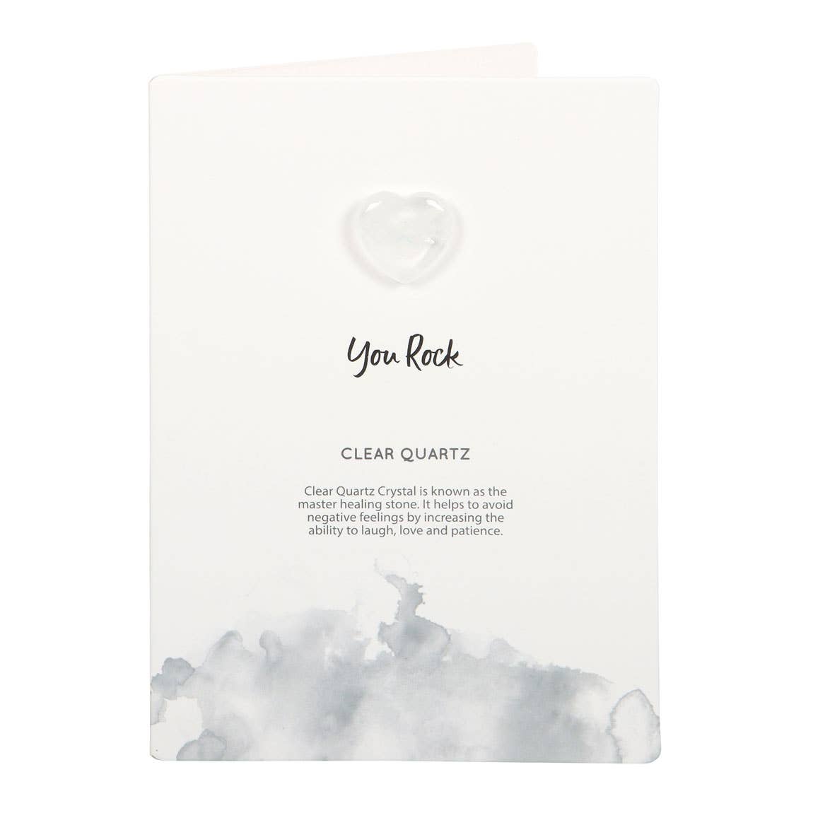 Gift the power of positivity with this heartfelt crystal greeting card. It includes a small clear quartz crystal heart and features the message ‘You Rock.’ Known as the master healing stone, clear quartz helps promote positivity and patience while warding off negative feelings. The card is blank inside for your personal message.