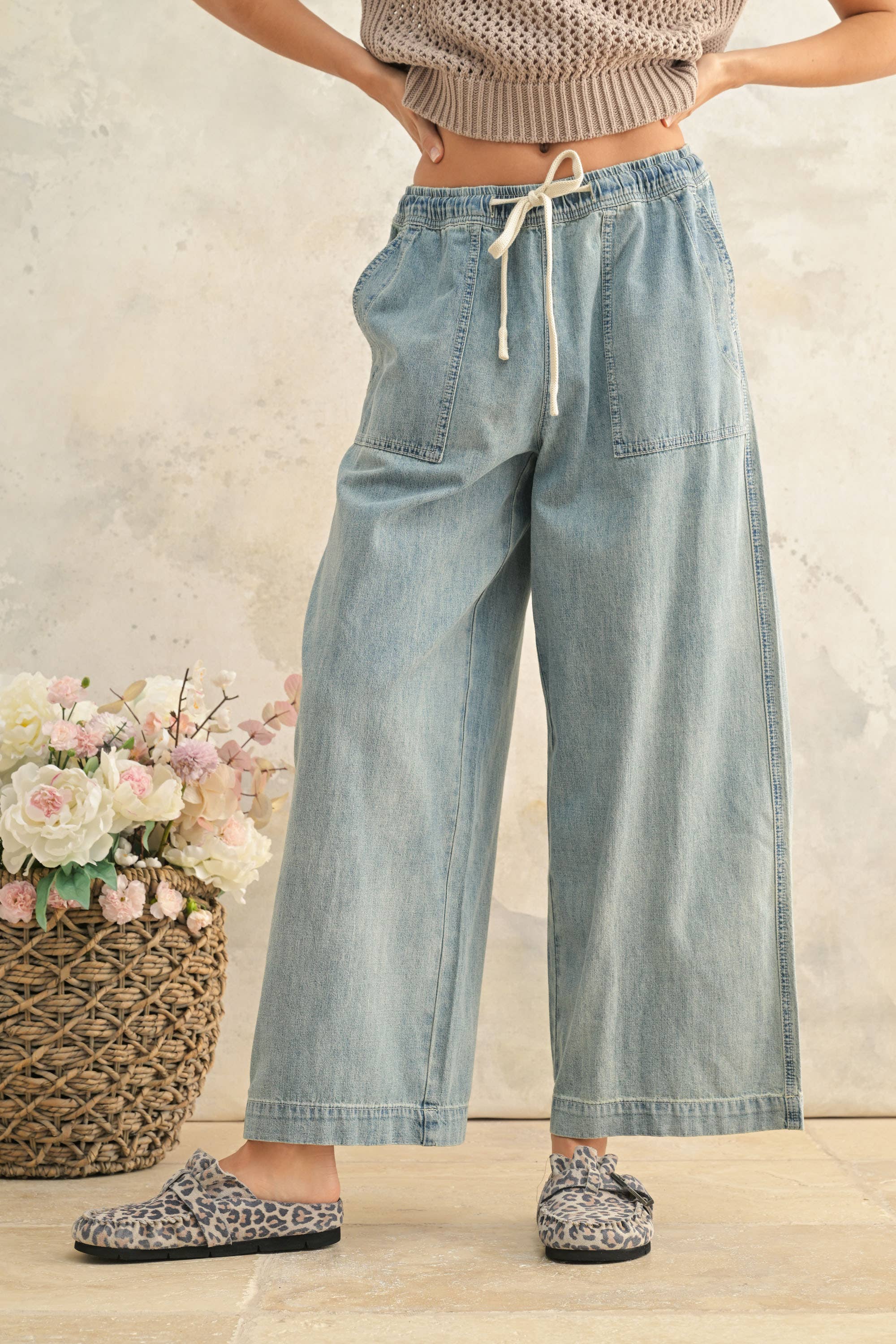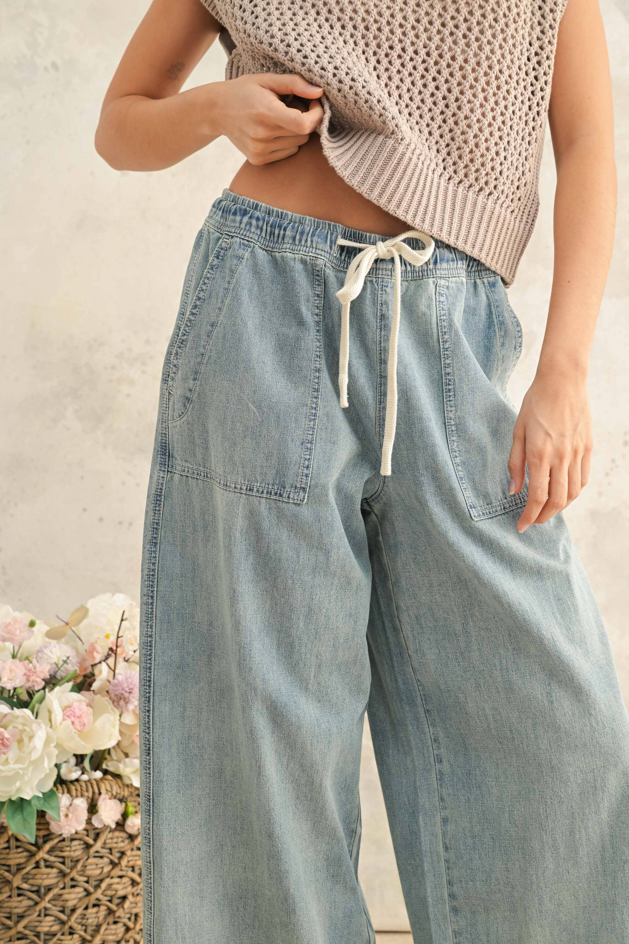 Relaxed and easy, these wide-leg light wash denim pants feature a comfy elastic waistband with a drawstring tie. Perfect for everyday wear, they blend casual comfort with a laid-back, chic silhouette.