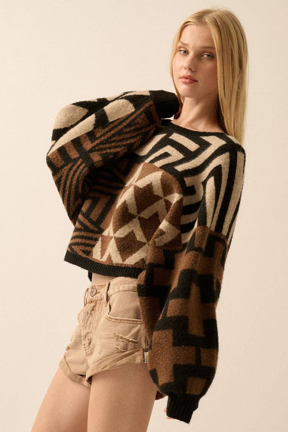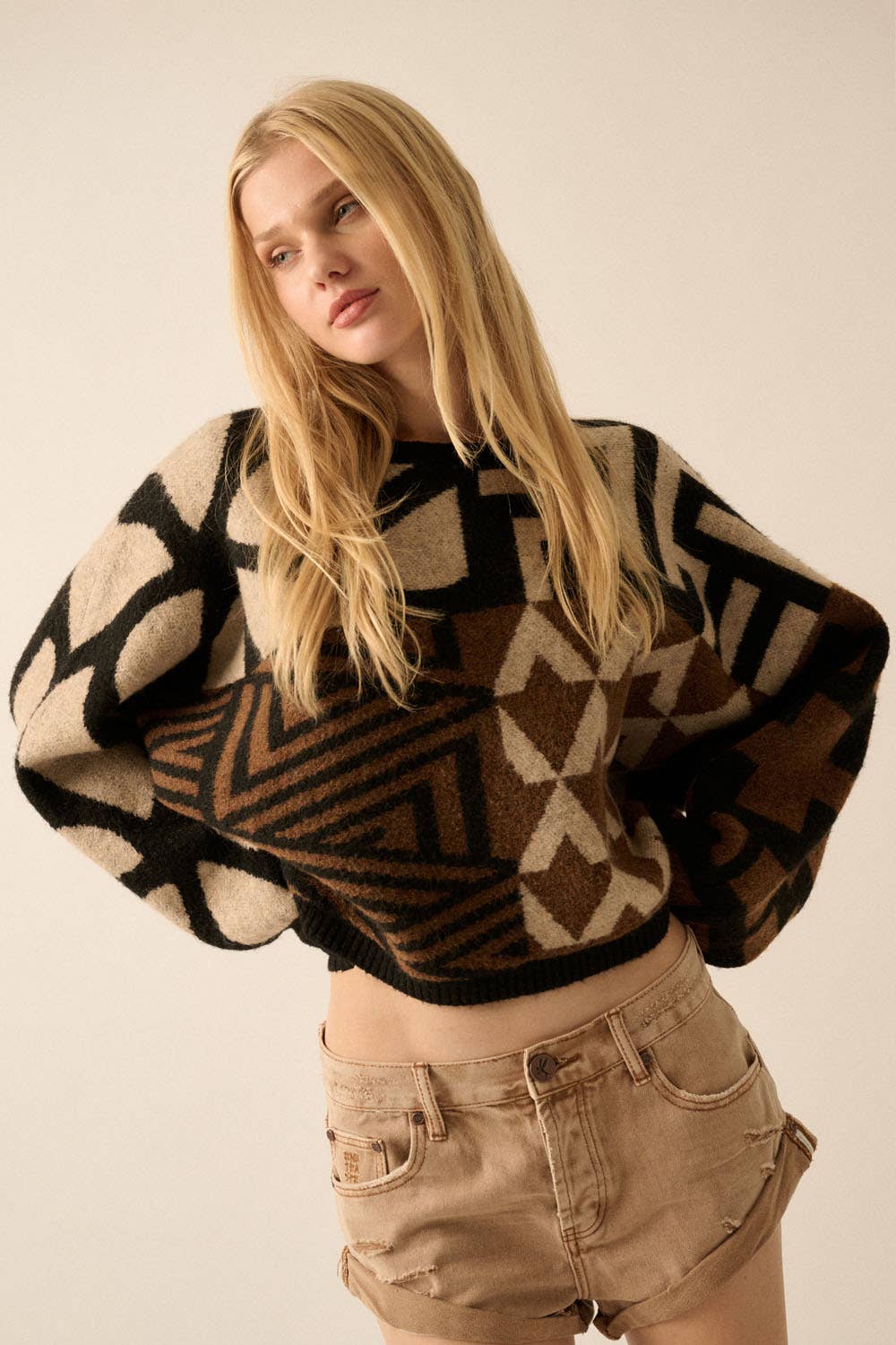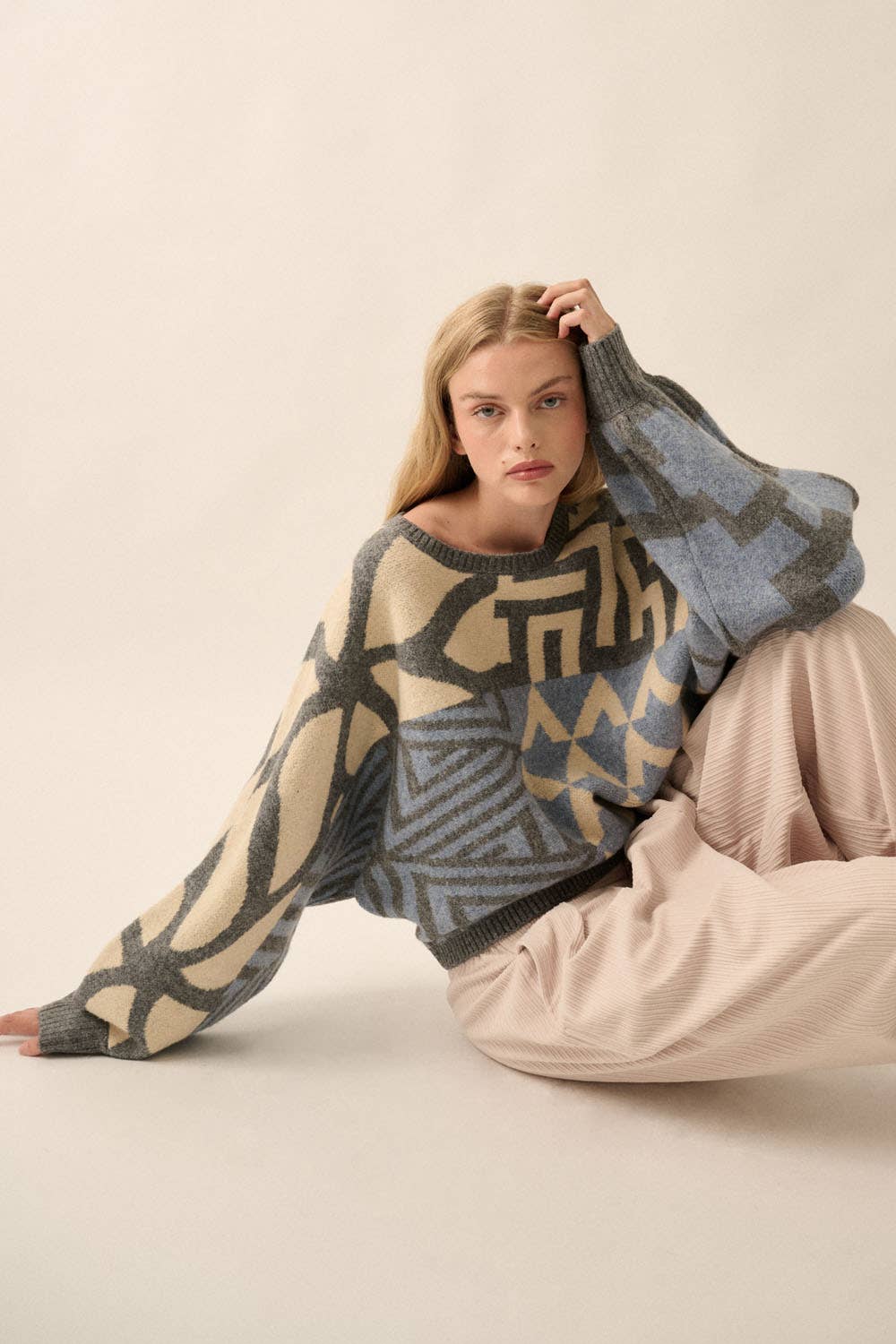 Make a bold statement with this geometric patterned sweater, blending soft neutrals with eye-catching shapes. Its relaxed fit and cozy knit make it perfect for layering, while the abstract design adds a modern, artsy edge to your everyday look.
