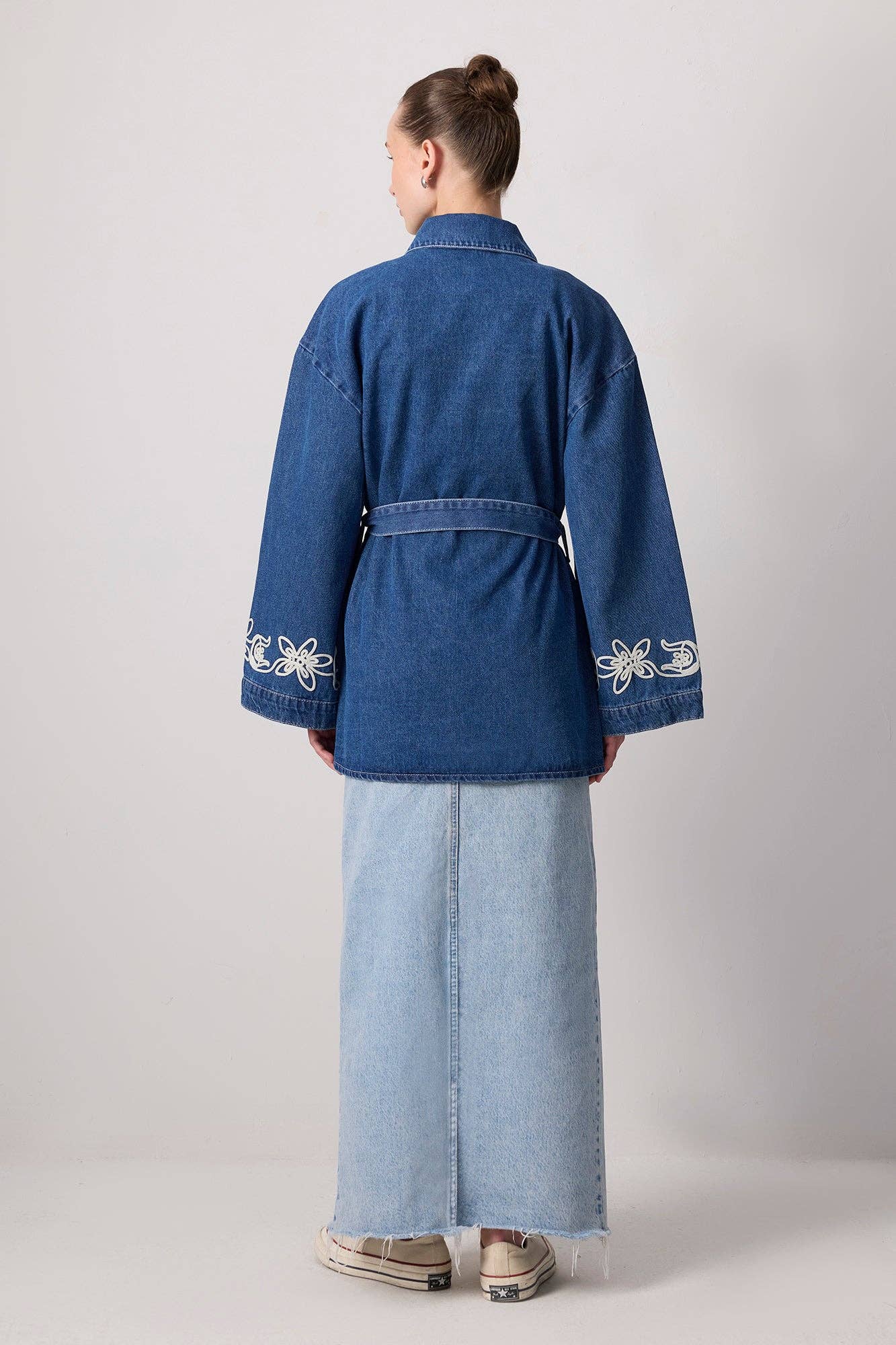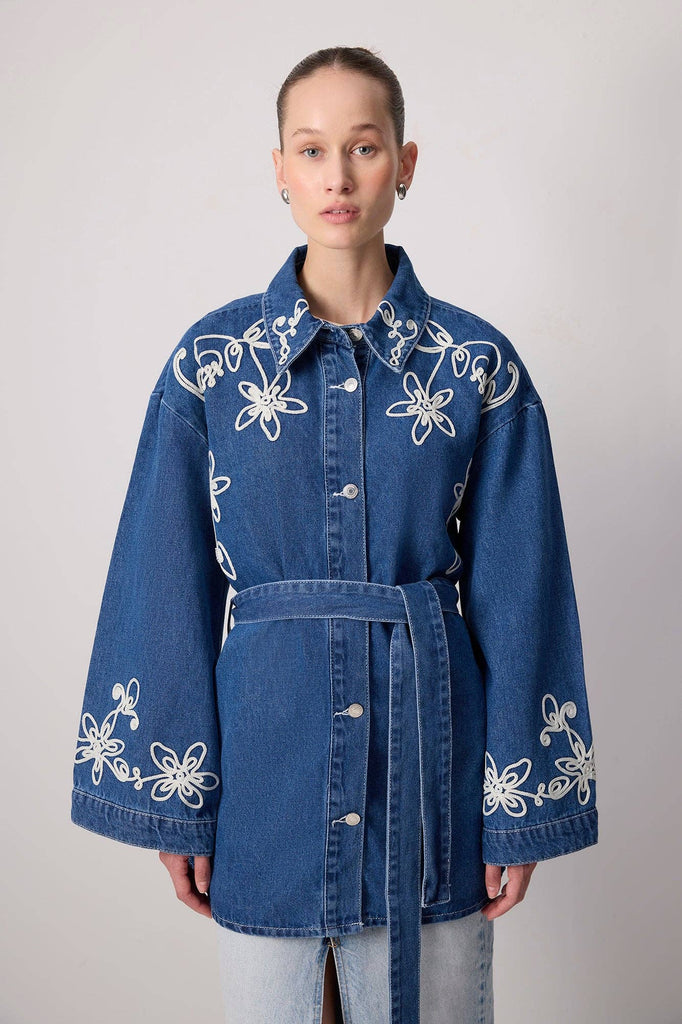 The Dahlia Jacket brings playful charm with its oversized denim silhouette, featuring bold white floral embroidery and a soft belt to cinch the waist. Wide sleeves and structured stitching make it an effortlessly stylish layering piece.