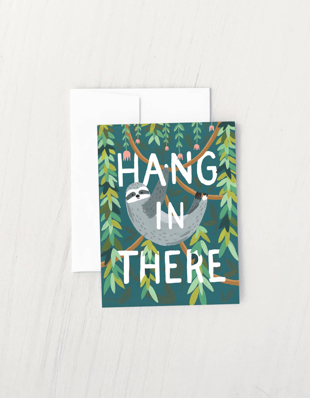 Send a little encouragement with this adorable "Hang in There" card featuring a smiling sloth hanging from a tree branch among leafy vines. A perfect pick-me-up for anyone needing a boost—whether it’s finals week, a tough day, or just life doing its thing.