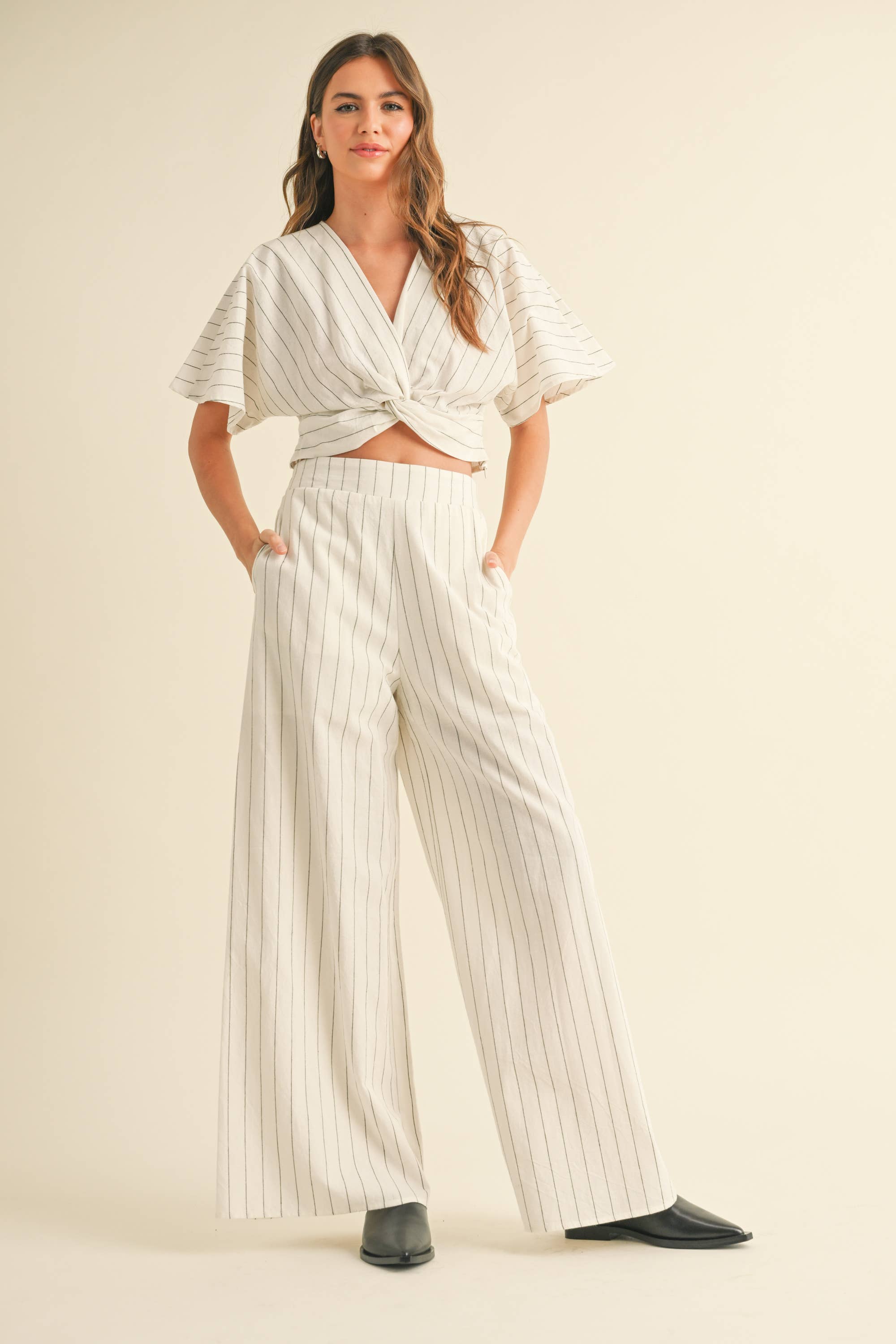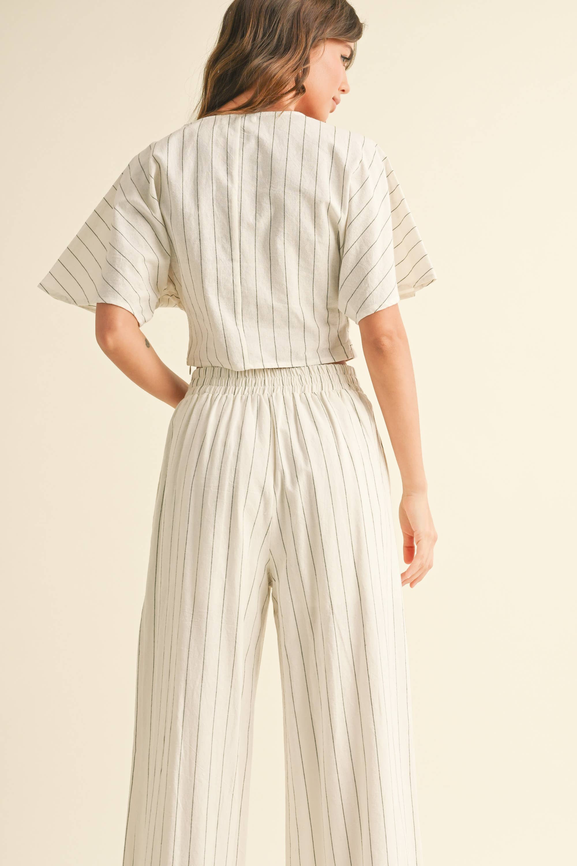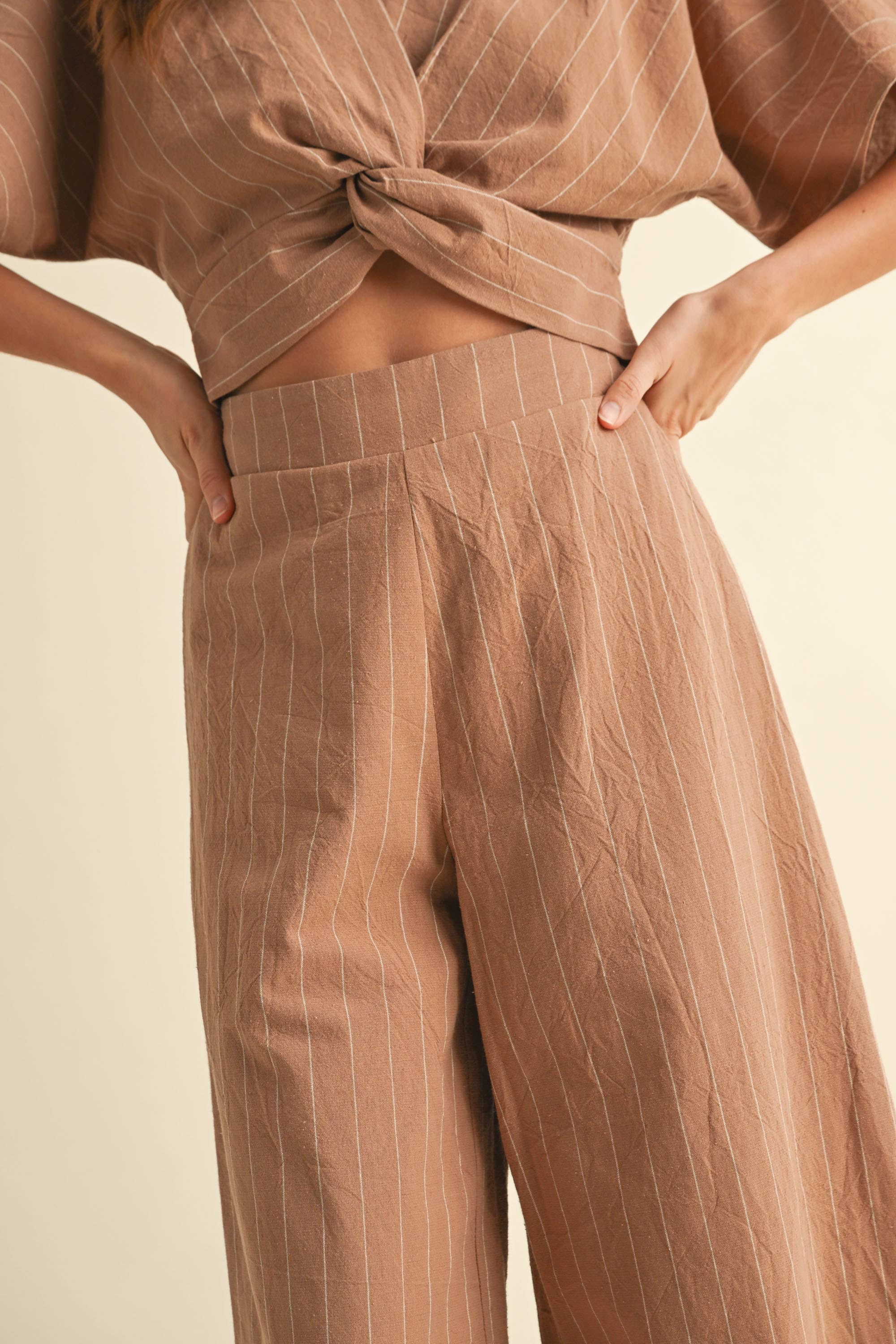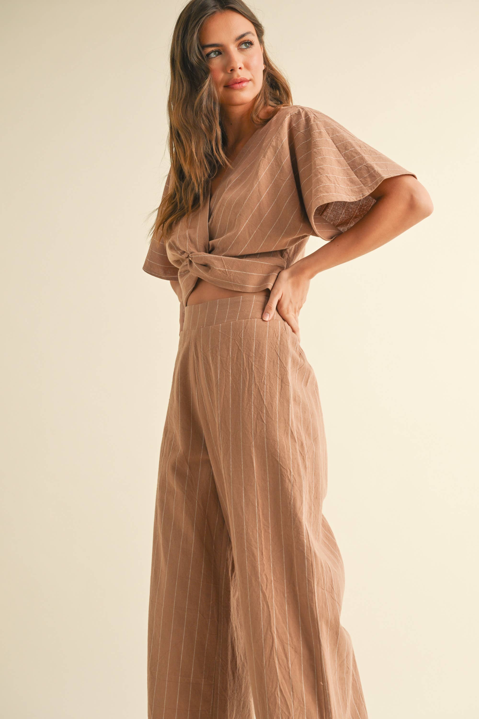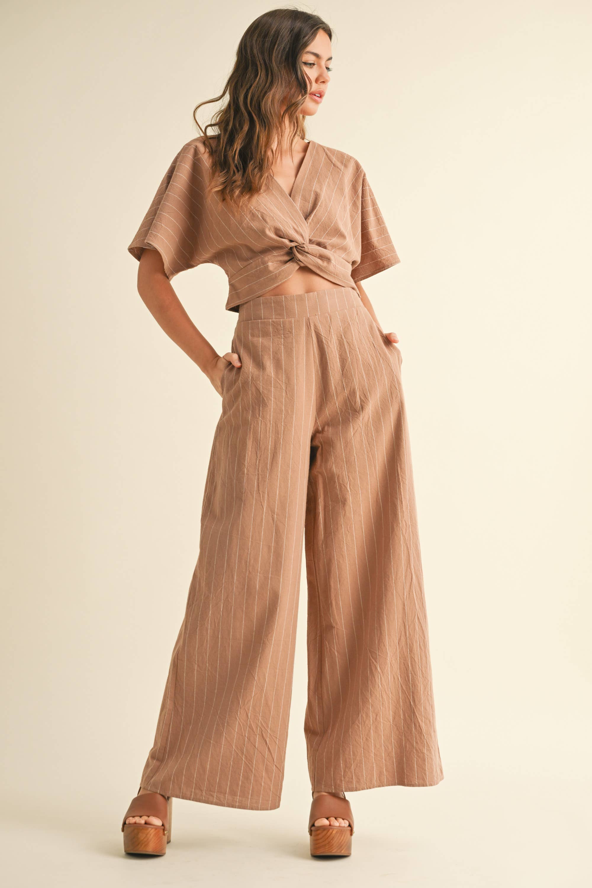 A laid-back, effortlessly tailored set that brings structure to summer days. This lightweight co-ord features a short-sleeve twist-front crop top and matching high-waisted wide-leg pants perfect for strolling beach towns or casual weekend brunches.