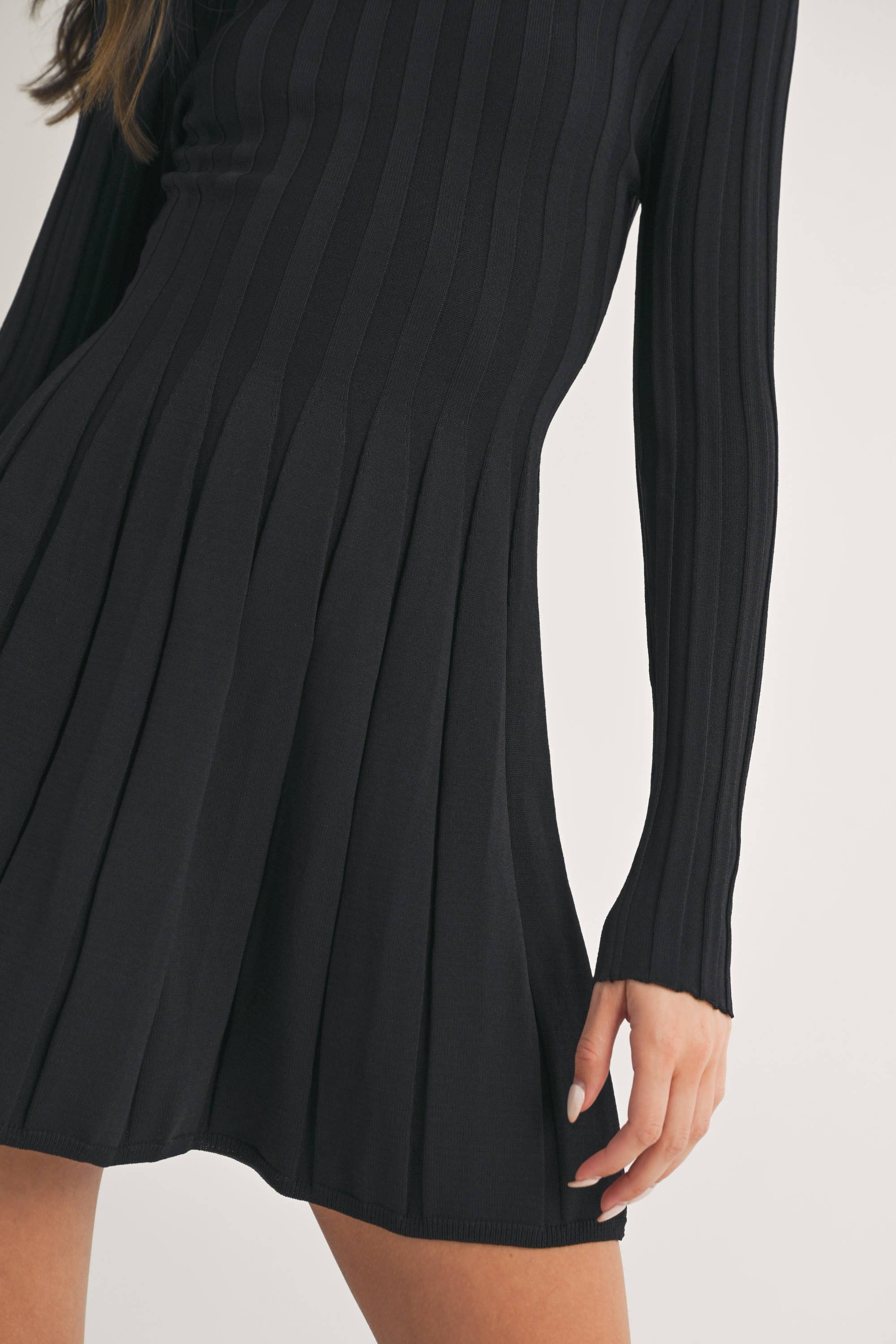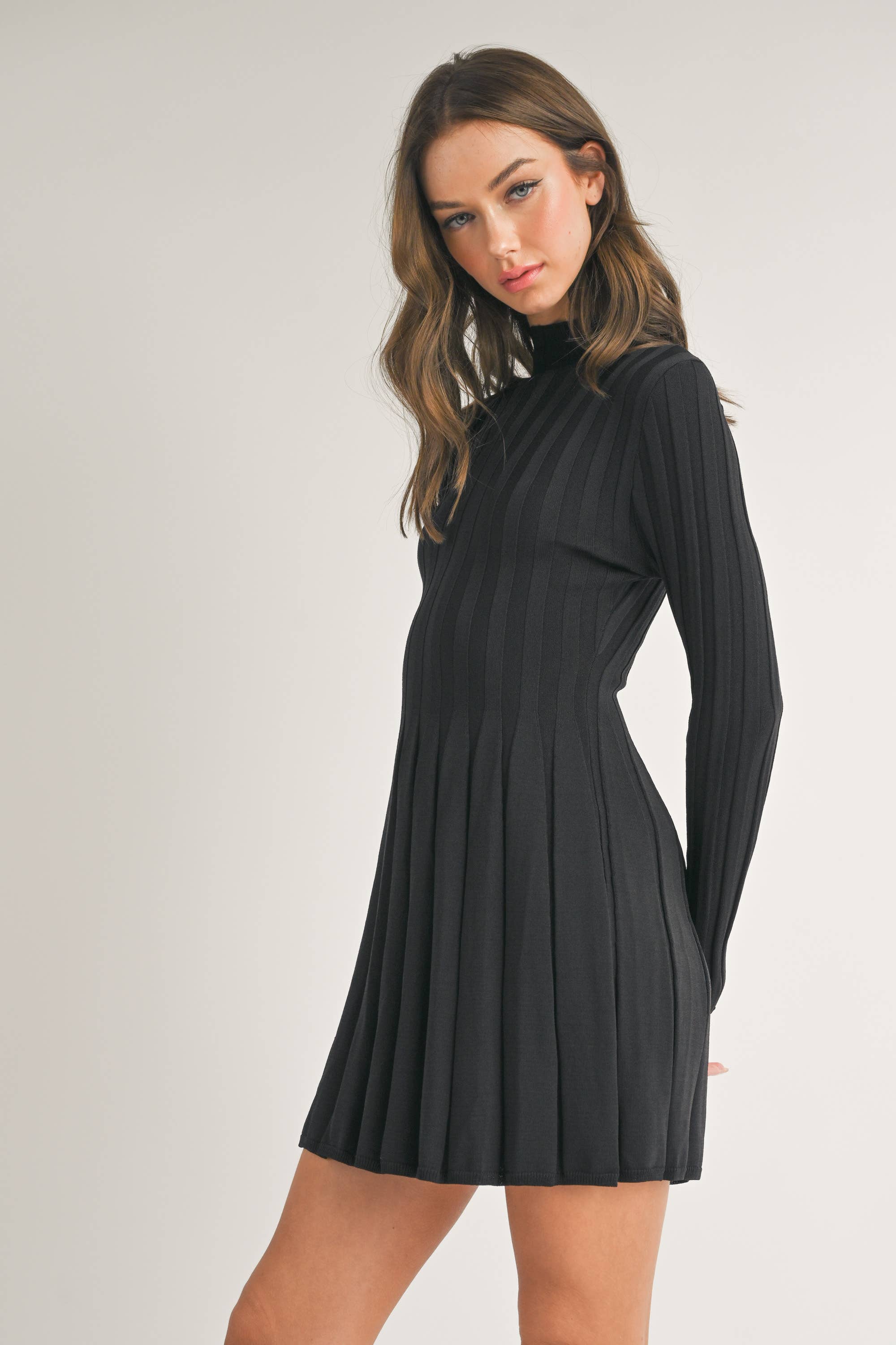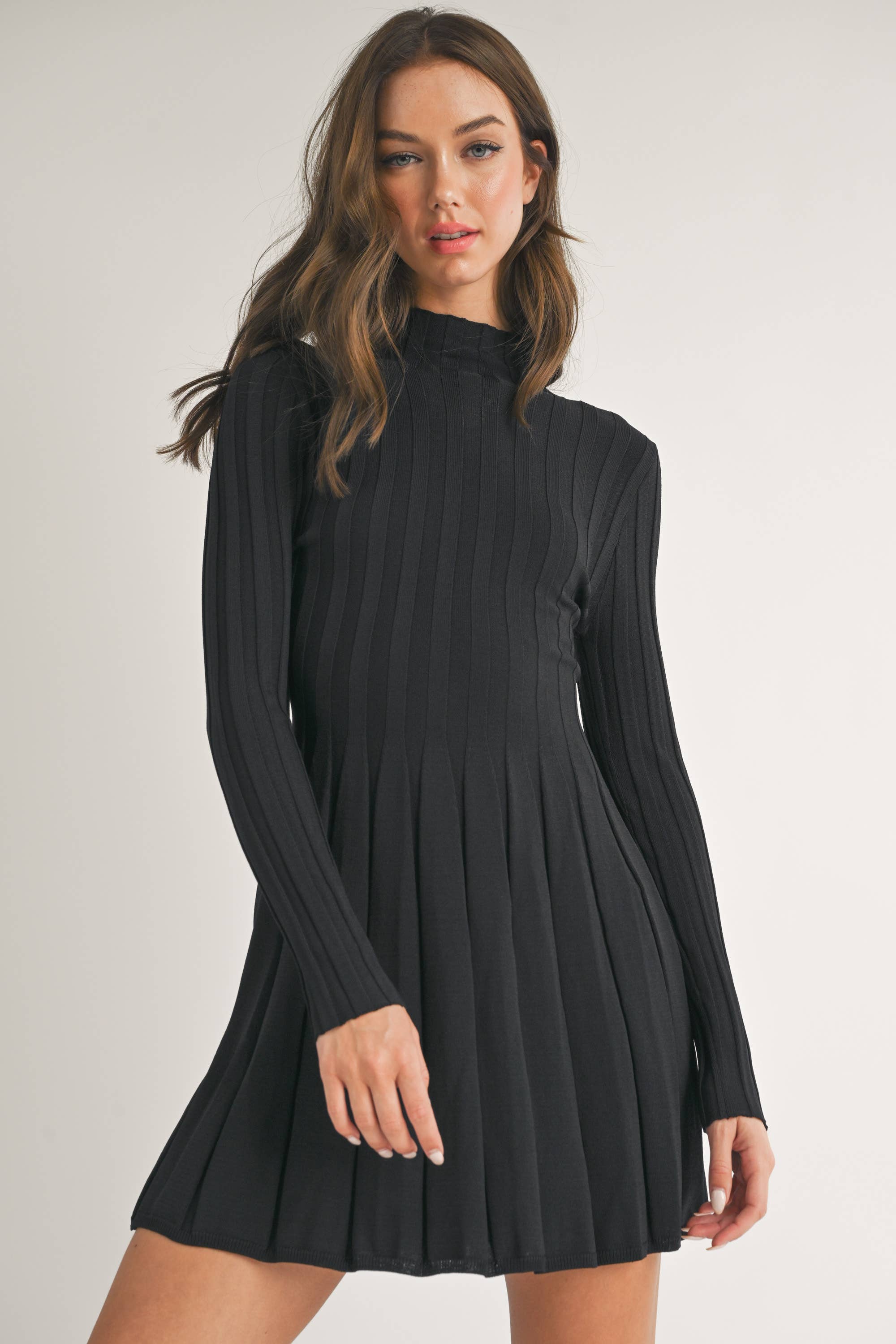 This ribbed long-sleeve mini dress blends comfort with a sleek, elevated silhouette. Its fitted top and flowy pleated hem make it perfect for day-to-night styling.