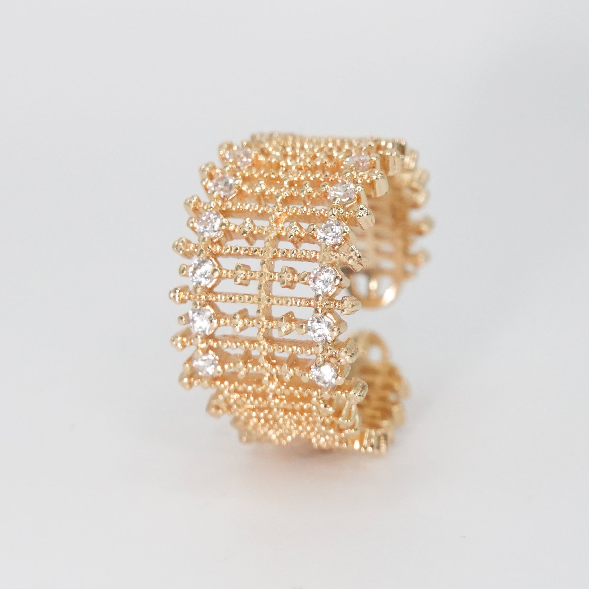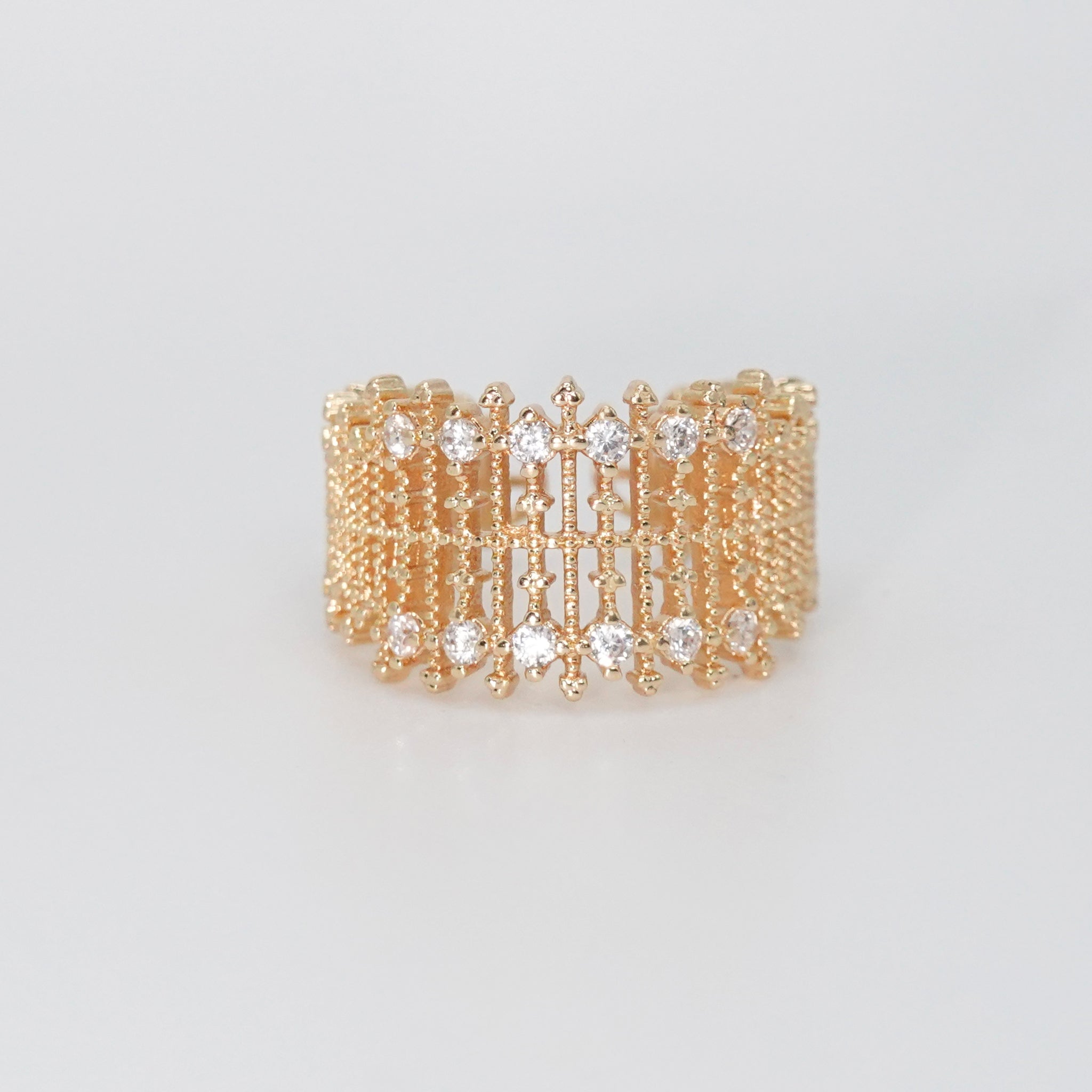 Elevate your ensemble with the Lunita Ring, boasting a distinctive design adorned with shimmering stones. This captivating piece adds a touch of elegance and individuality to any look.