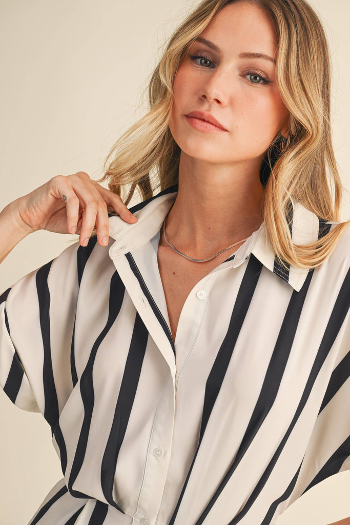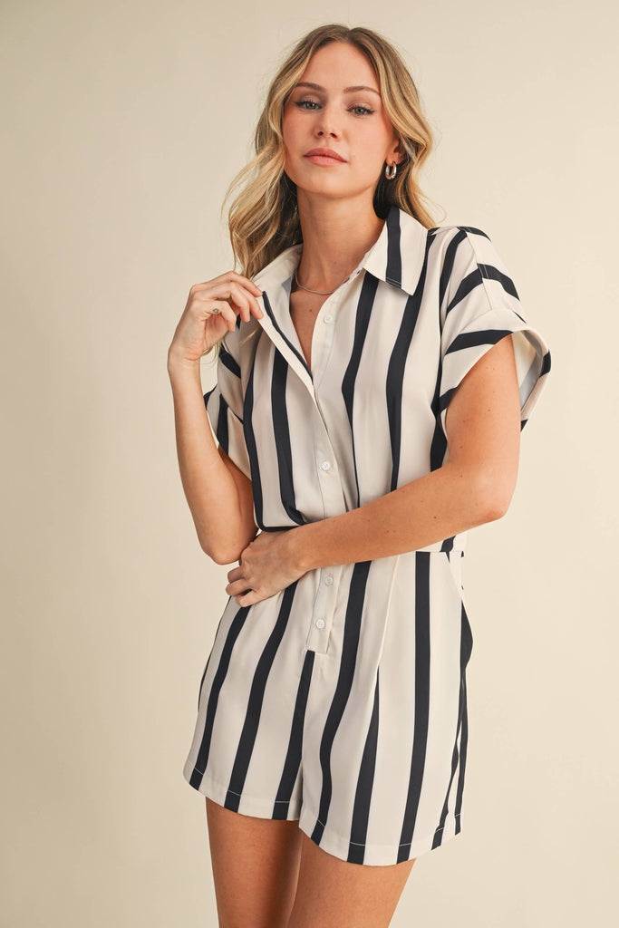 Sophisticated yet effortless, this button-up romper features bold vertical stripes, short cuffed sleeves, and a tie-back waist for a cinched silhouette. Whether styled up with heels or dressed down with sneakers, it’s an instant power piece for summer.