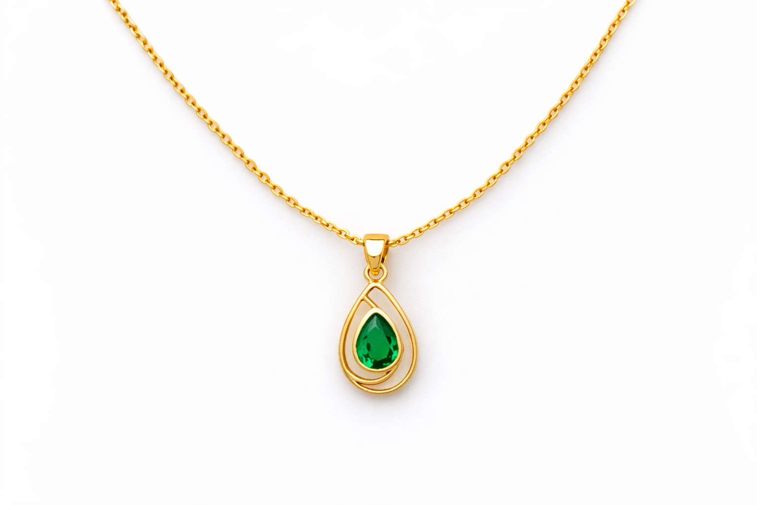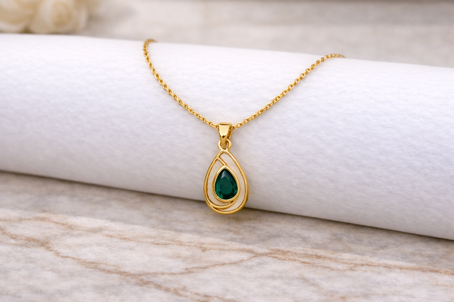 A radiant teardrop pendant featuring a deep emerald-green stone nested inside a sleek open-drop frame. Elegant with a modern twist, it adds a rich pop of color and layers beautifully with everyday chains.
