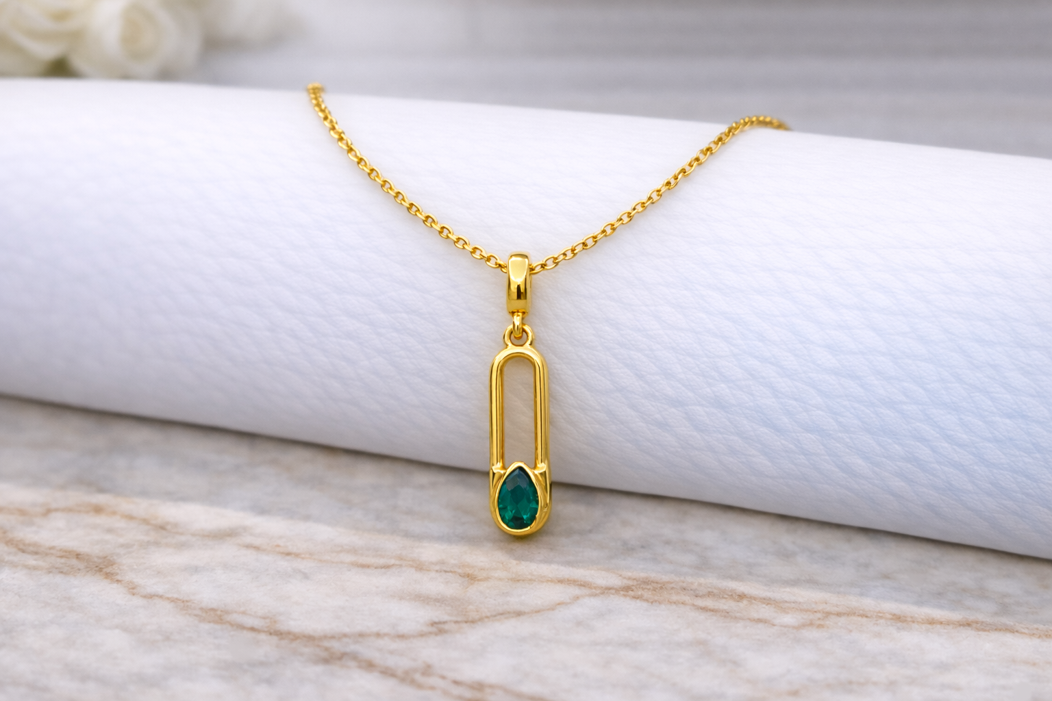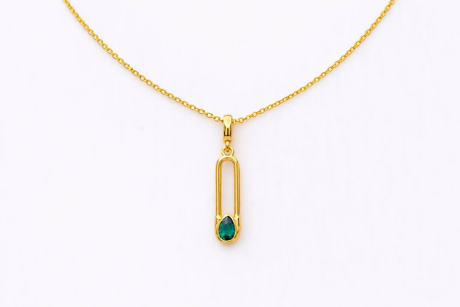 This modern safety-pin pendant brings a sleek, minimal vibe with a pop of green sparkle at the tip. Wear it solo for a clean statement or layer it for an effortless everyday look.