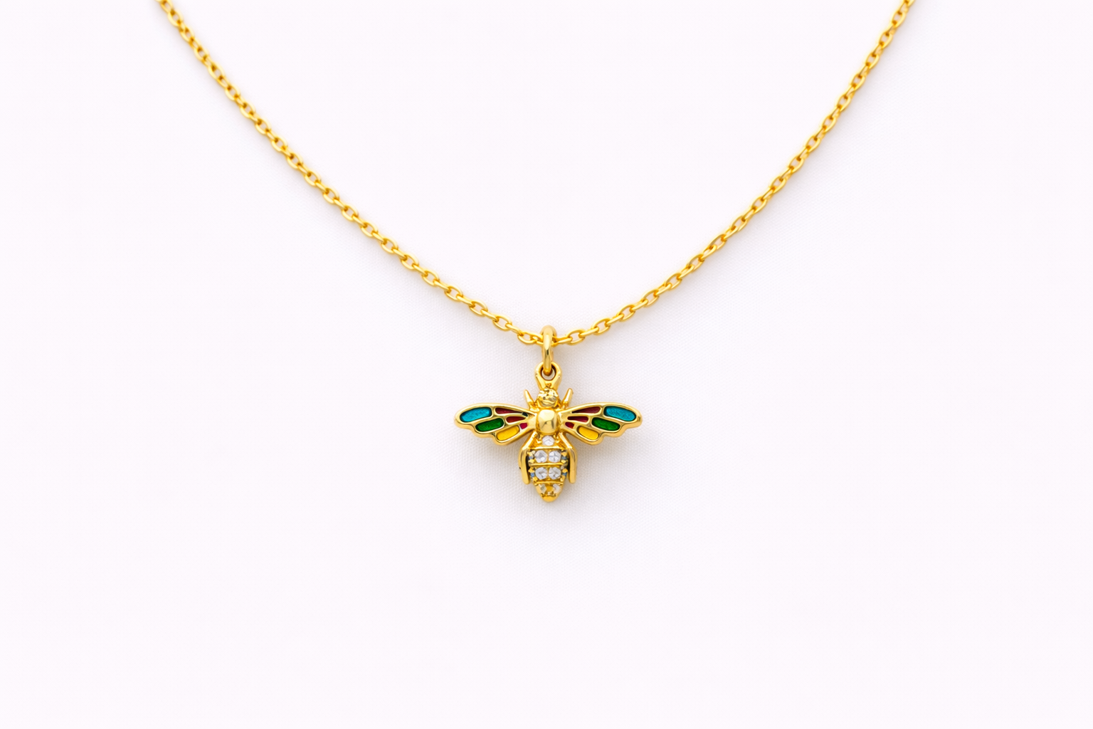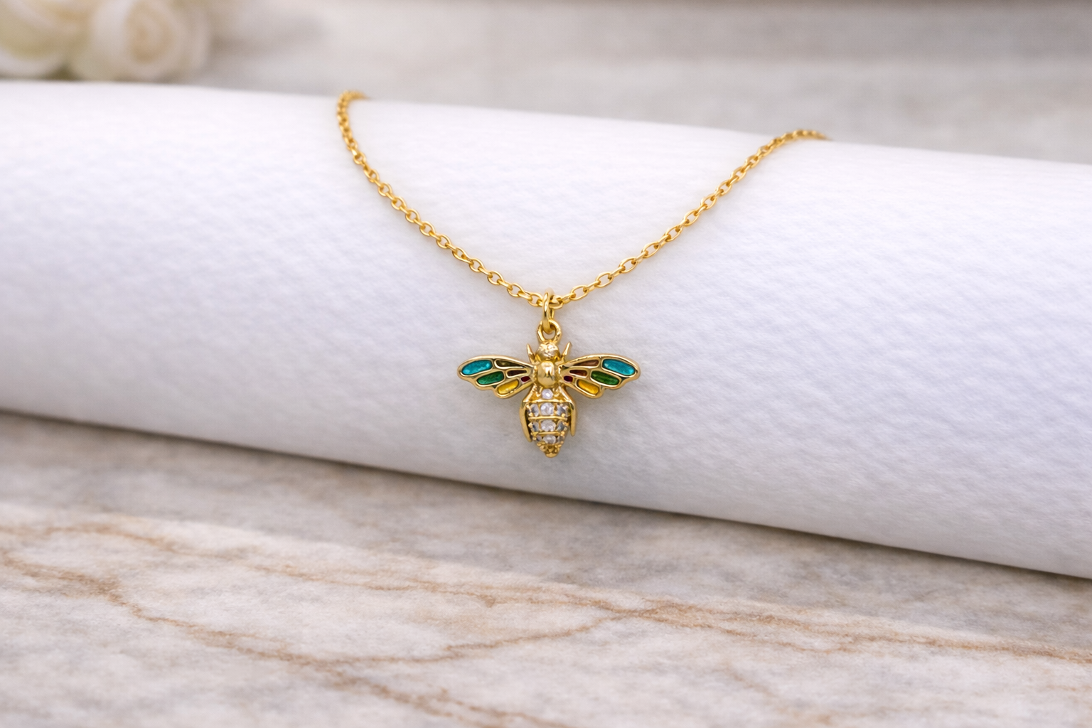 A sweet little bee pendant with glossy enamel wings and sparkling accents that catches the light without feeling too flashy. Perfect for everyday wear, it layers beautifully with other chains and adds a playful, polished touch to any look.