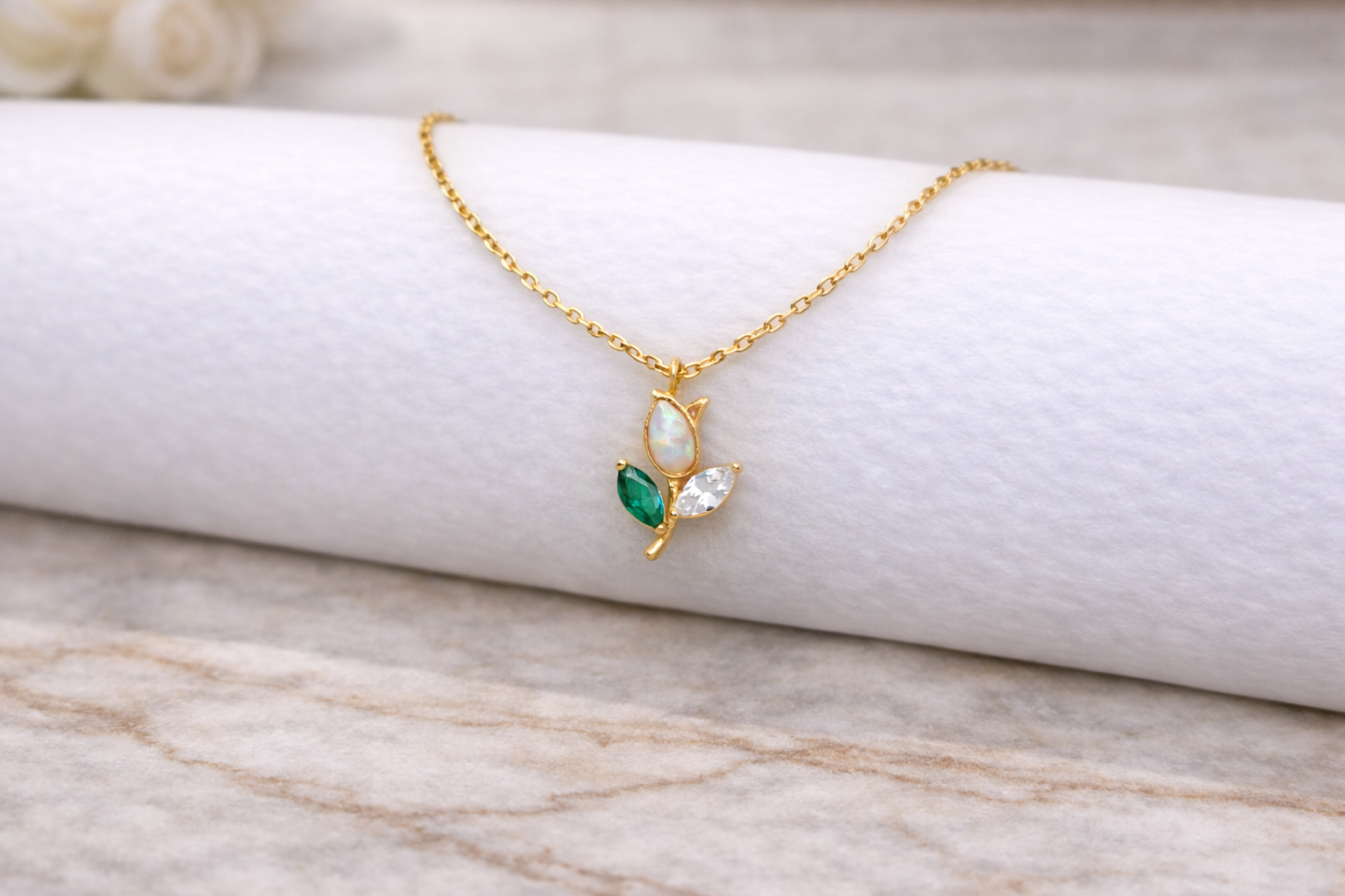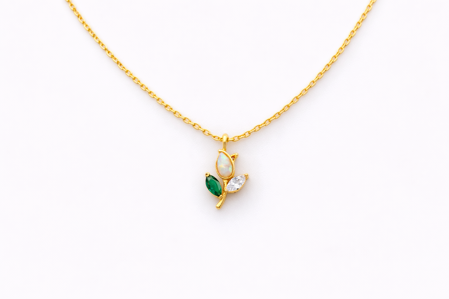 Delicate and bright, this tiny botanical pendant pairs a glowing opal drop with sparkling leaf-cut stones for a fresh, nature-inspired look. It’s the perfect everyday necklace for layering, gifting, or adding a soft pop of shimmer to any outfit.