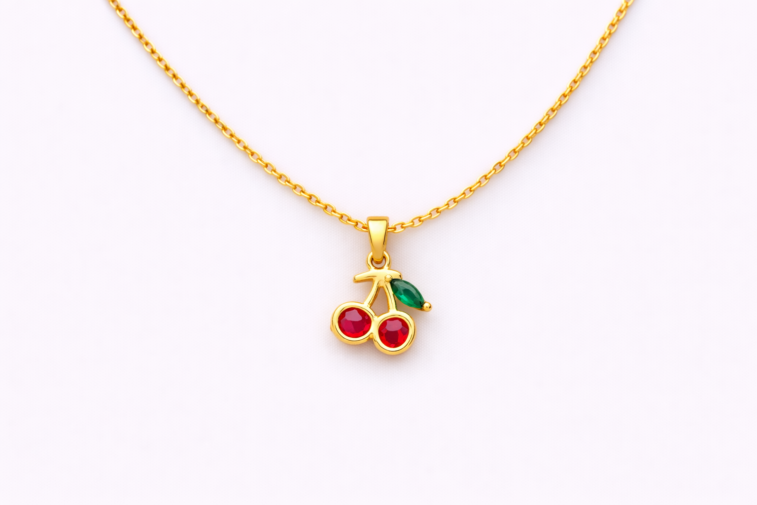 A playful cherry pendant with glossy red stones and a tiny green leaf, finished in a sleek gold-tone setting. It’s the perfect pop of color for everyday layering or a fun, flirty standalone statement.
