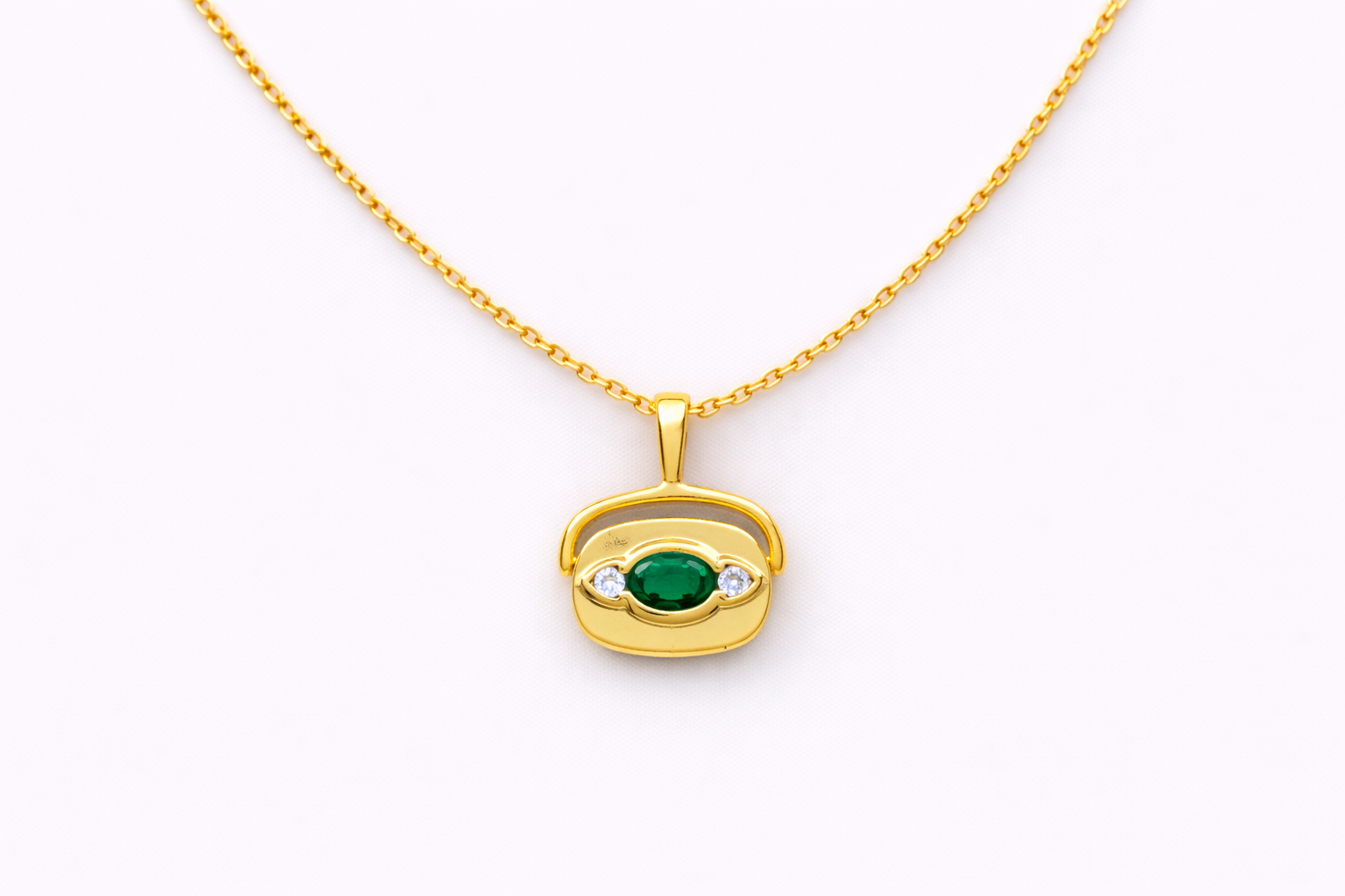 A playful mini handbag pendant with a rich green center stone and two sparkling clear accents, finished in glossy gold. It’s the perfect everyday charm for stacking, gifting, and adding a little “city chic” to any look.