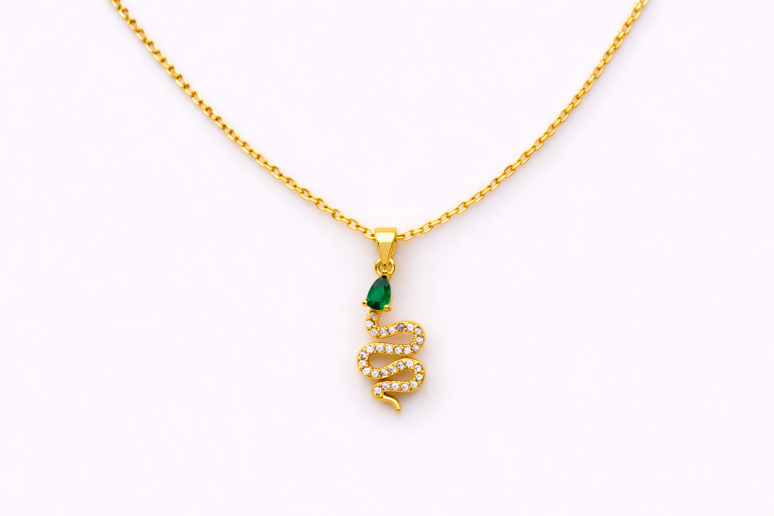 A sleek, crystal-pavé snake pendant adds a bold little sparkle to your everyday chain. Finished with a vivid green accent stone, it’s the perfect mix of edgy and elegant.