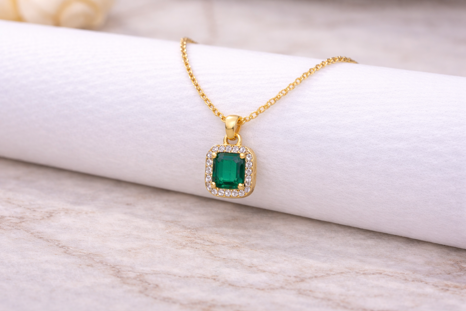 A sleek square-cut green stone sits in a sparkling halo, giving this necklace a clean, luxe glow that works day or night. Finished with a polished gold-tone setting and delicate chain, it’s perfect for layering or wearing solo as your signature piece.