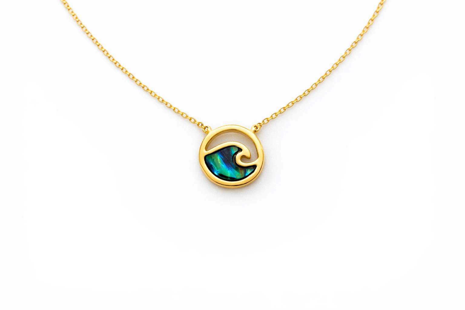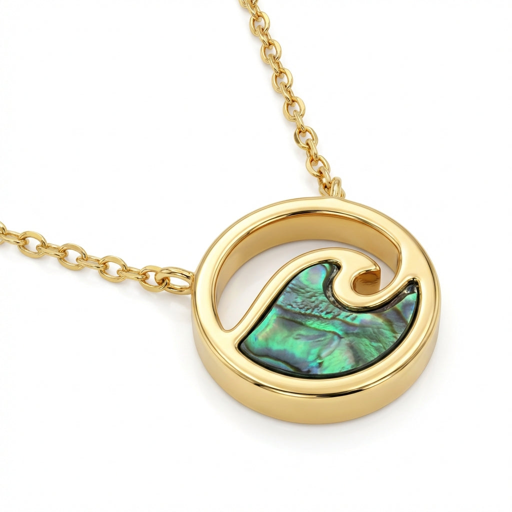 A sleek wave silhouette frames a shimmering ocean-toned inlay that flashes blues and greens as it catches the light. Polished gold-tone edges keep it clean and modern perfect for everyday layering with a little coastal attitude.