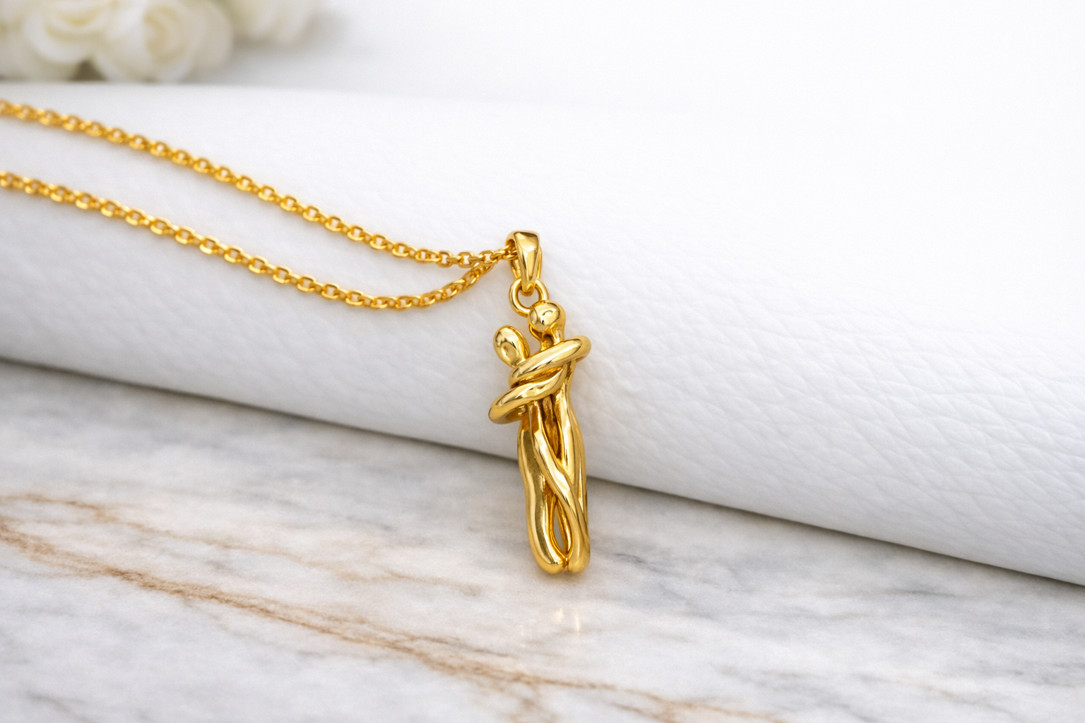 This sculptural gold-tone pendant captures a sweet “embrace” moment in a clean, modern silhouette that feels both romantic and minimal. Perfect for everyday layering or gifting, it adds a warm glow and a little meaning to any neckline.