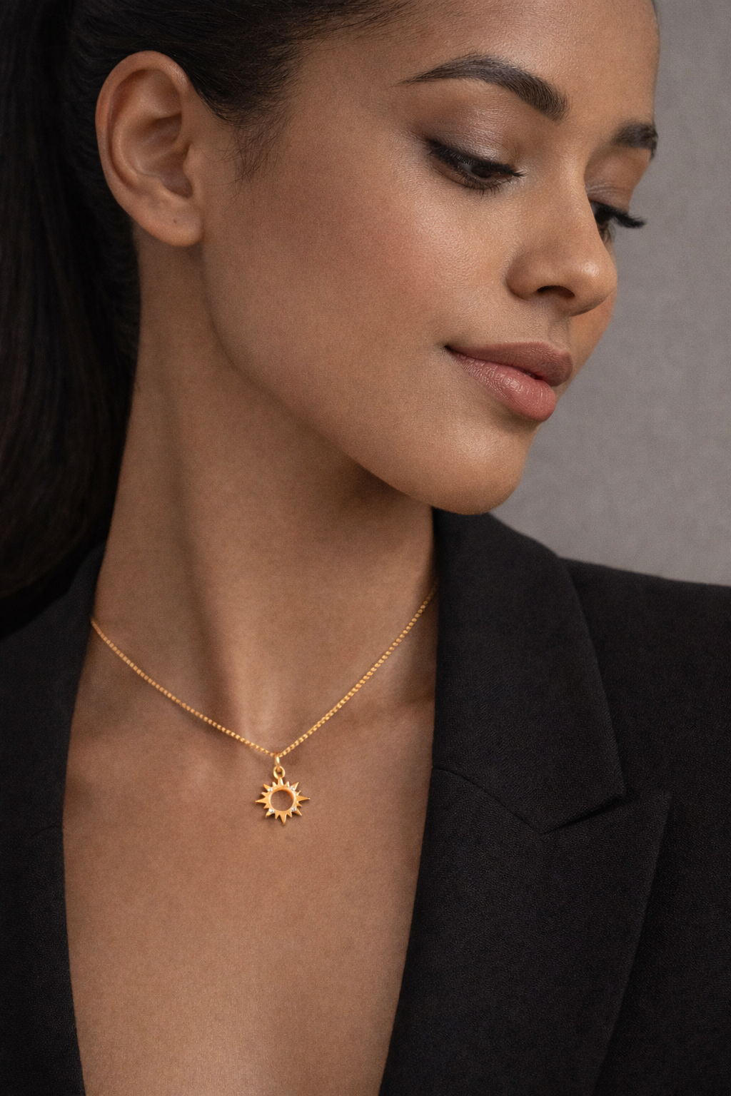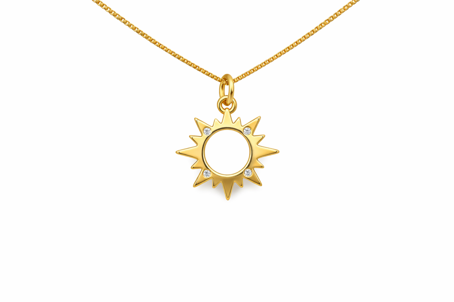 A crisp sunburst pendant with a clean open center and subtle sparkling accents for a modern, airy glow. Lightweight and easy to layer, it adds a bright, everyday statement with a celestial touch.