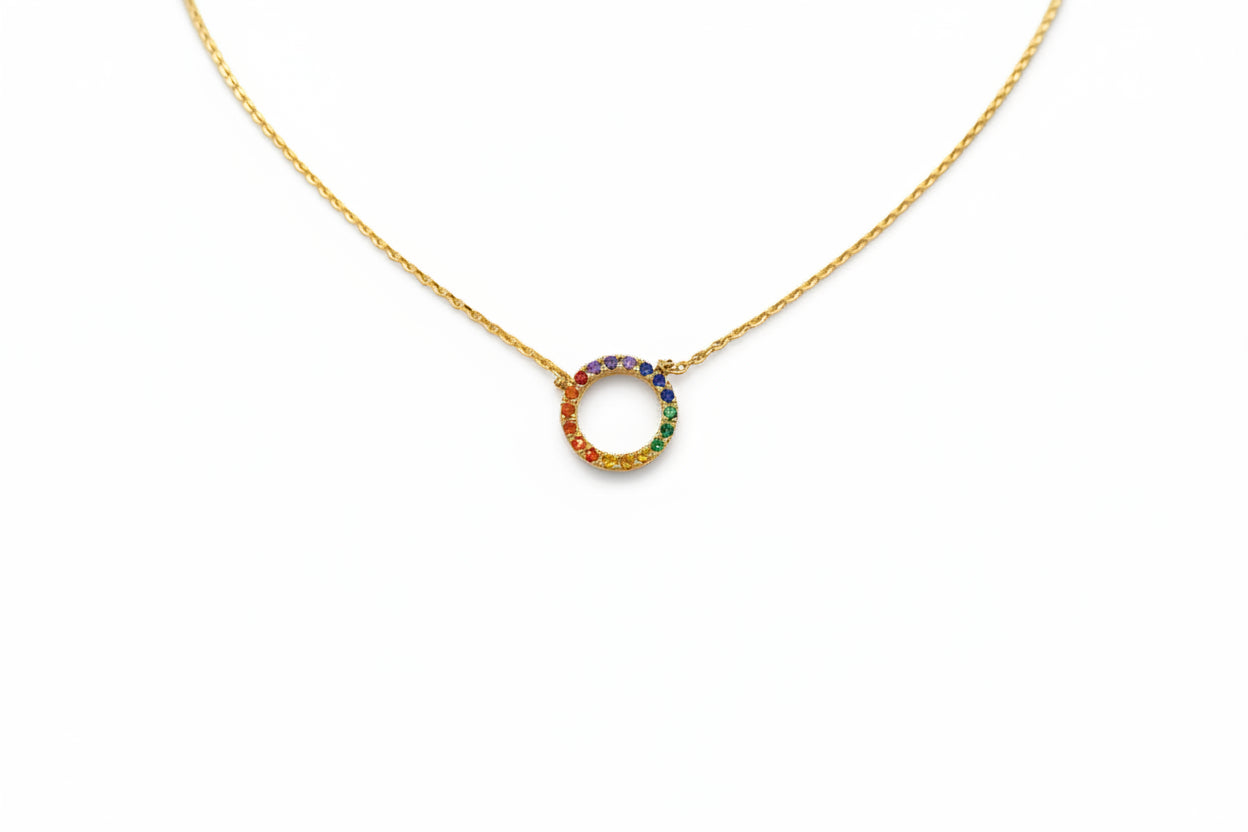A delicate gold chain finished with a sparkling open-circle pendant set in rainbow stones for a bright, modern pop. Easy to layer, but bold enough to wear solo when you want a little color and shine.