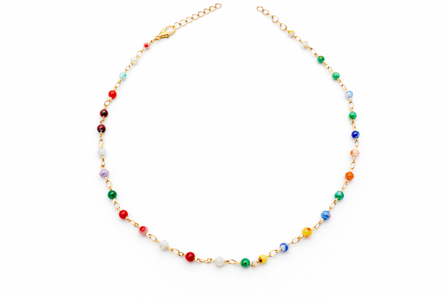 A playful gold-link necklace sprinkled with tiny multicolor beads for that effortless “vacation all year” vibe. Lightweight, layer-friendly, and perfect for adding a pop of color to tees, tanks, or dresses.