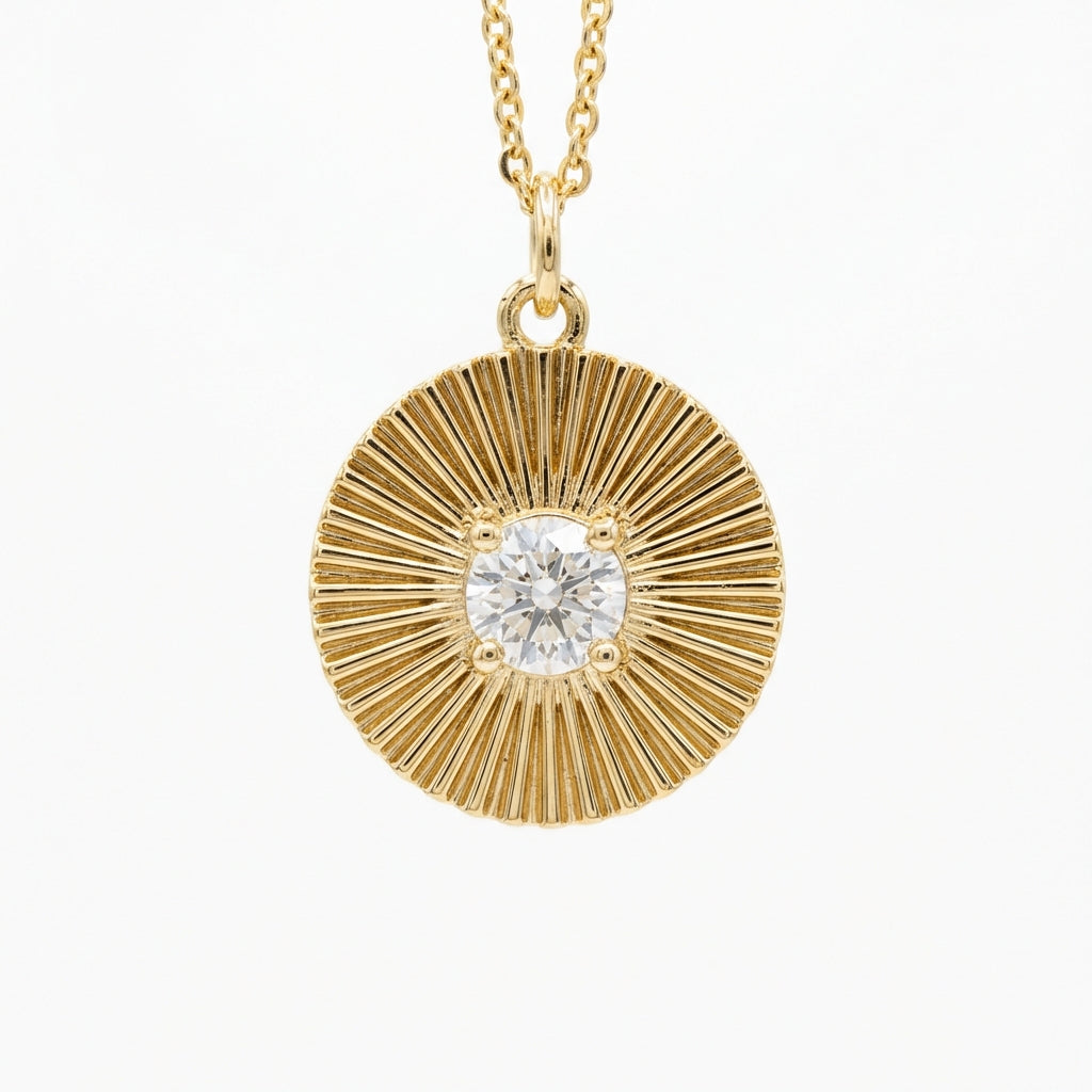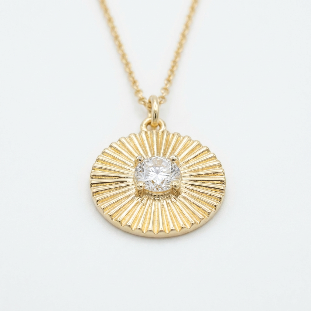 This gold sunburst pendant necklace adds a warm, glowy pop with its radiant ridged detailing and a clear center stone that catches the light. Perfect for everyday layering or wearing solo, it gives that “golden hour” shine in a clean, minimal way.