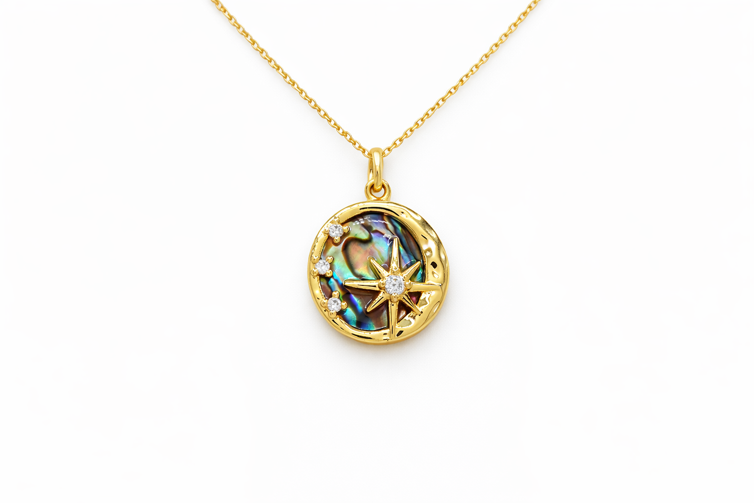 A dreamy abalone-shell pendant with a bold compass star and sparkling crystal accents—made to catch the light from every angle. Finished in a warm gold tone on a delicate chain, it’s the perfect everyday “good direction” piece for layering or wearing solo.