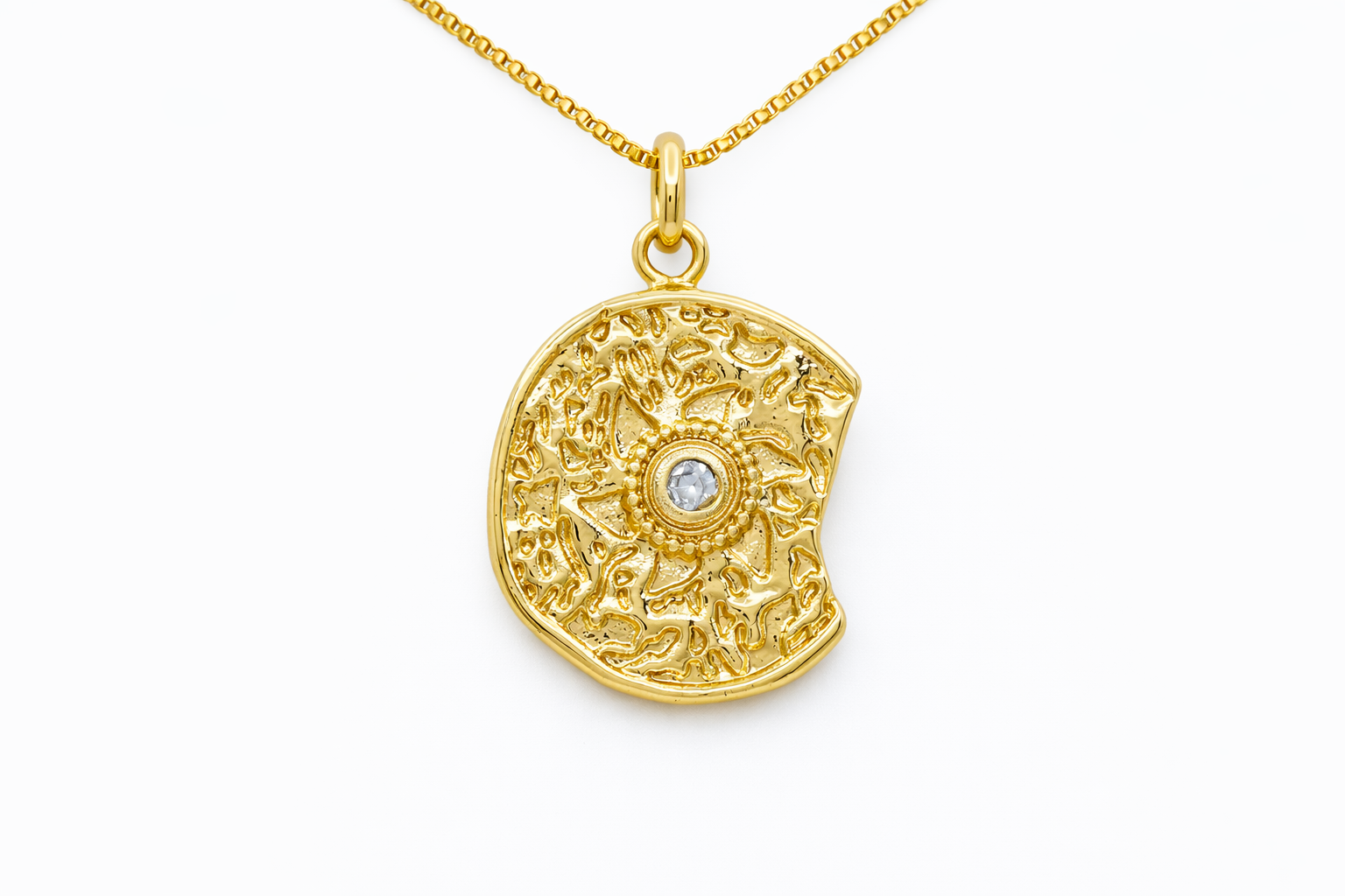 An artistic medallion pendant featuring organic textures and a radiant center detail that gives it a vintage-inspired, sun-kissed character. The sculptural surface and unique silhouette create a statement piece that feels both timeless and modern.