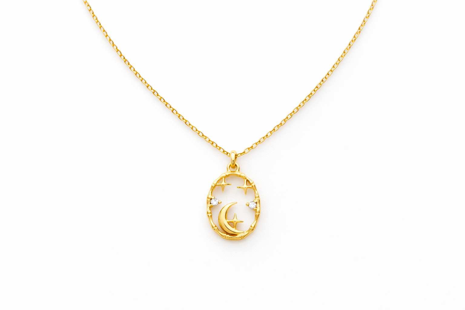 A dainty gold Filled necklace featuring an oval moon-and-stars charm with tiny crystal accents for a subtle sparkle. It’s the perfect everyday “little magic” piece easy to layer, or sweet on its own.