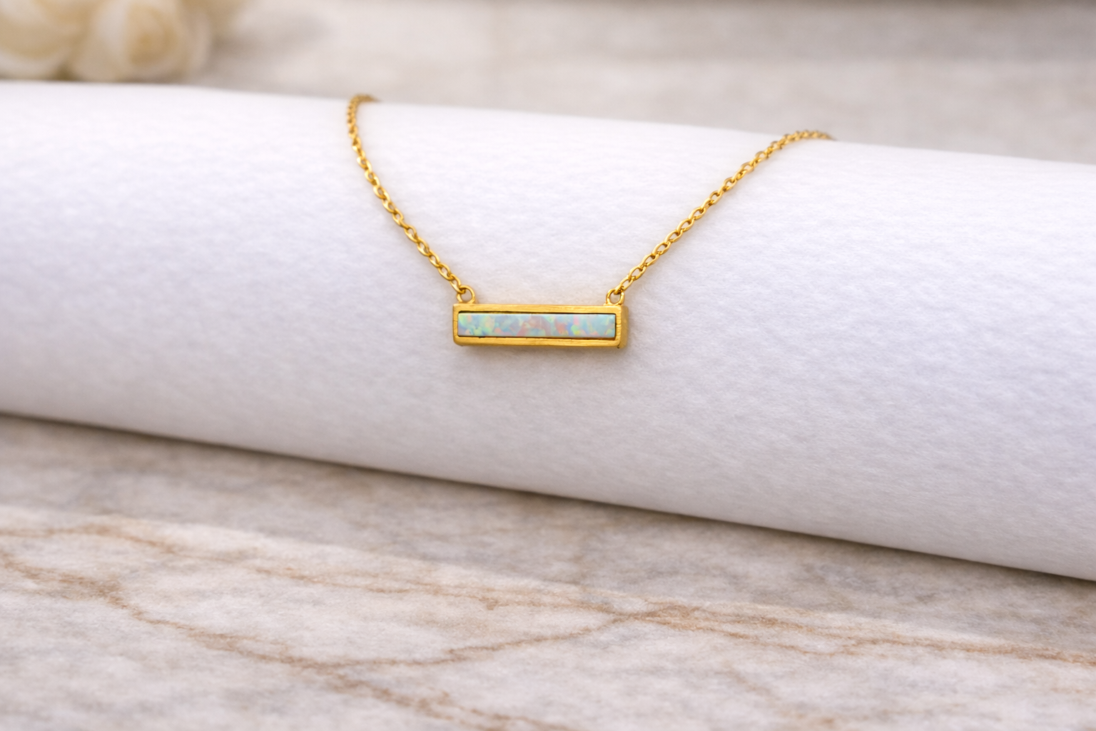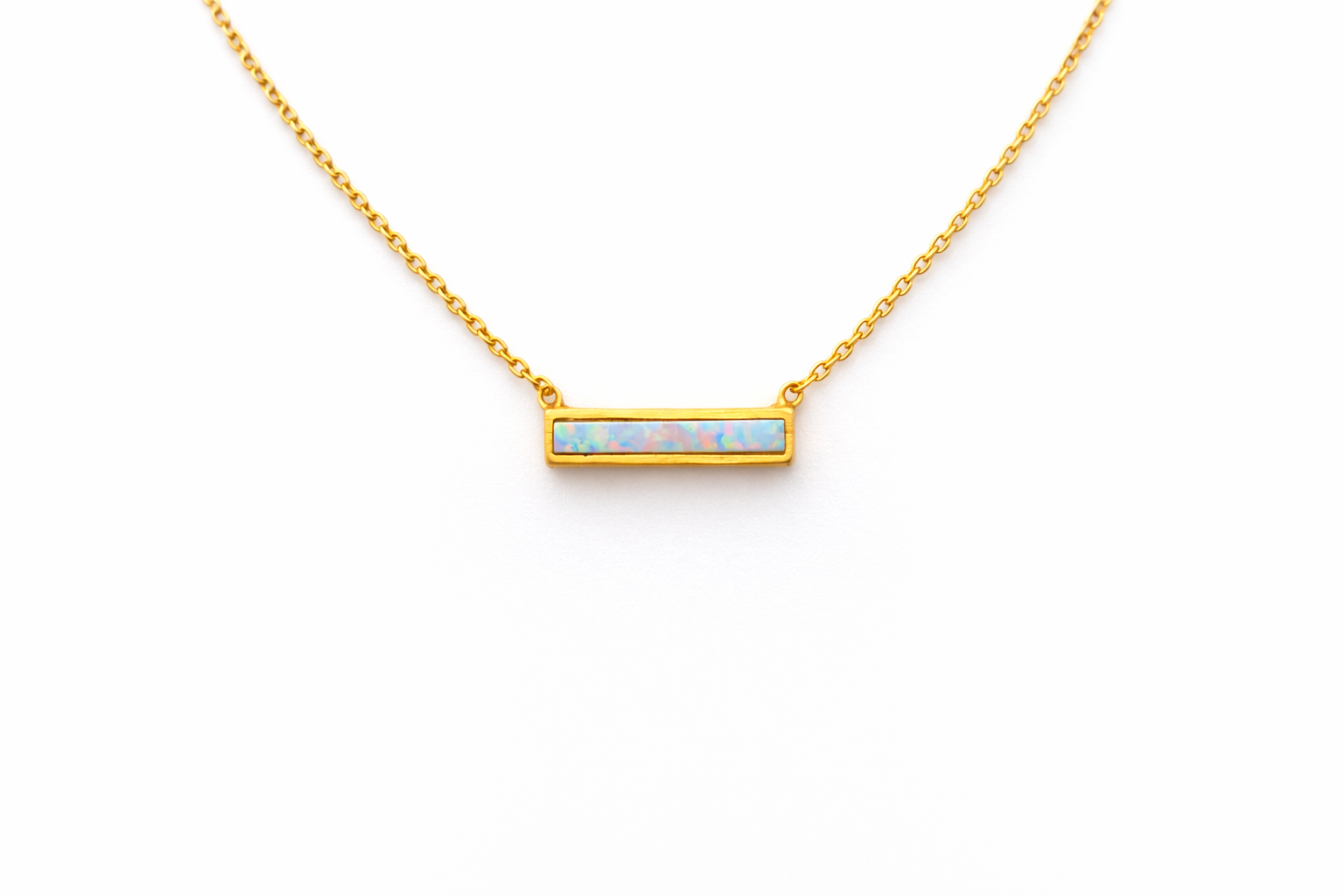 A sleek horizontal bar pendant featuring an opal-look inlay that flashes soft rainbow tones in the light. Minimal, modern, and made for layering this one adds a subtle pop of glow to any outfit.