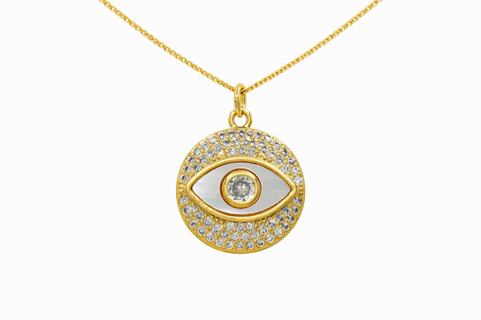 A captivating eye-inspired pendant surrounded by shimmering stones and a luminous center that catches the light beautifully. Its clean circular design and symbolic detail create a refined piece that feels both modern and meaningful.
