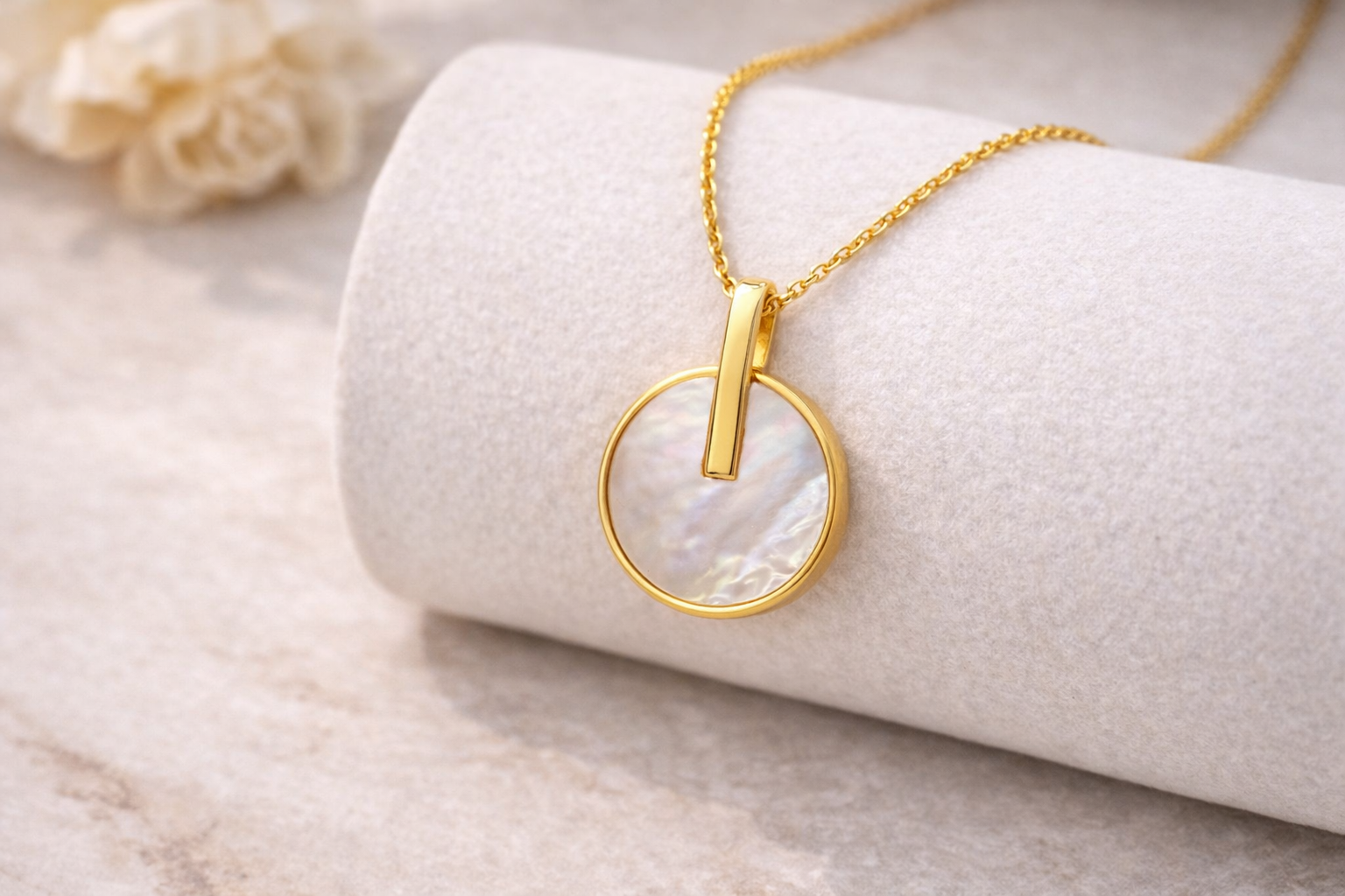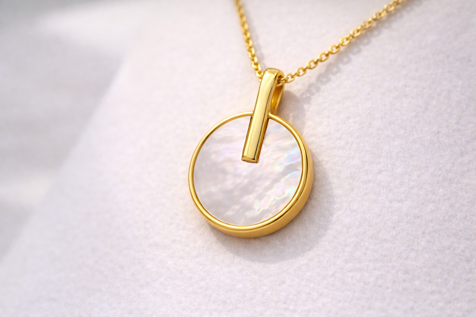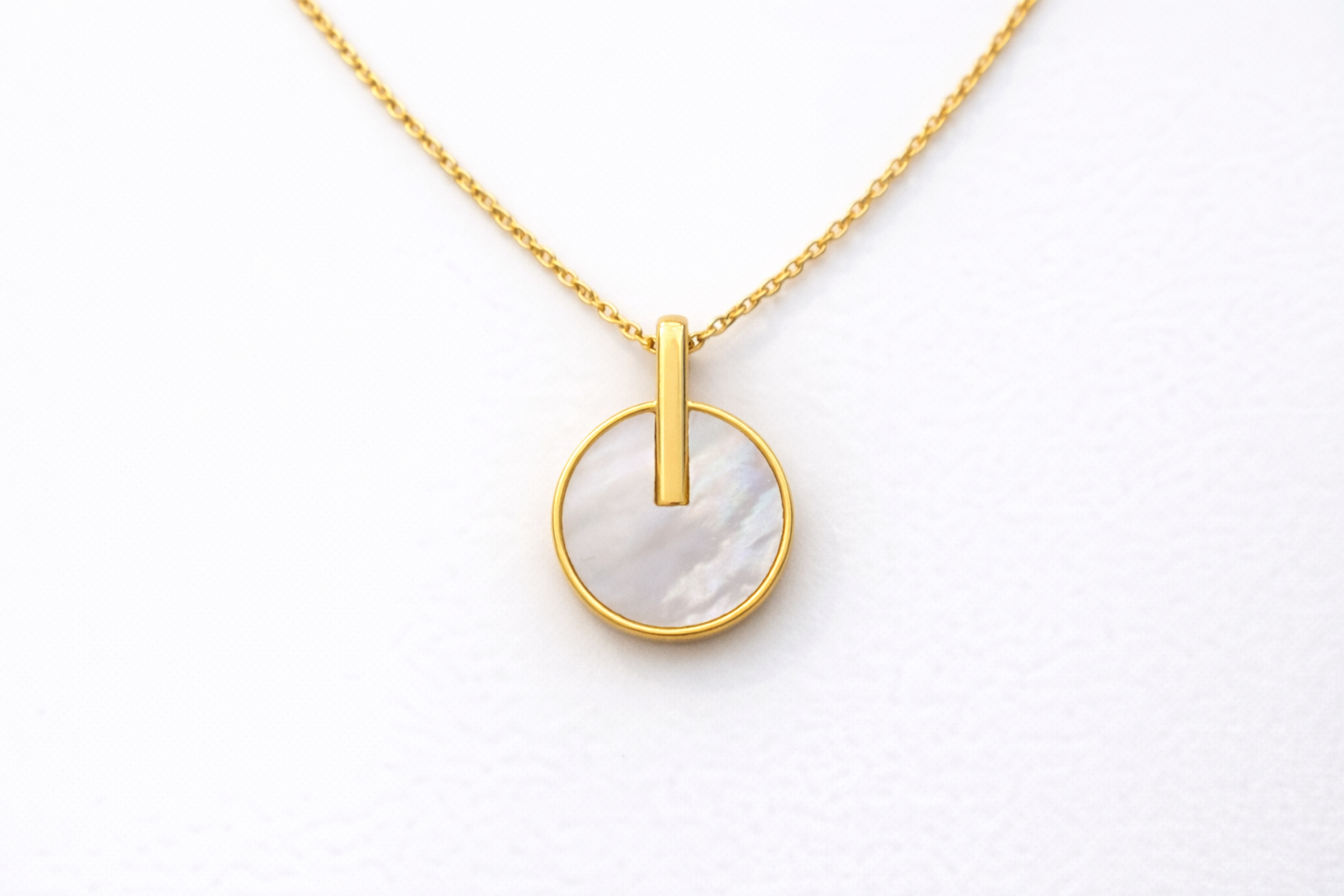 A modern circle pendant with a luminous mother-of-pearl inlay, finished with a sleek vertical bar for a clean, architectural look. Minimal yet eye-catching perfect for everyday wear and easy layering.