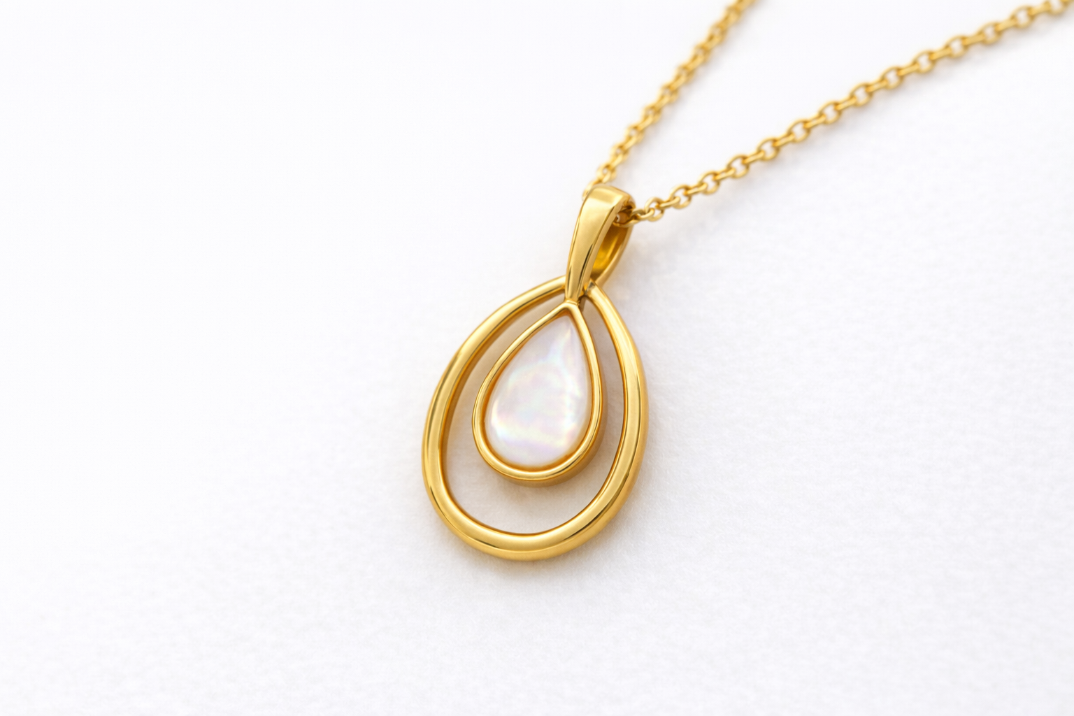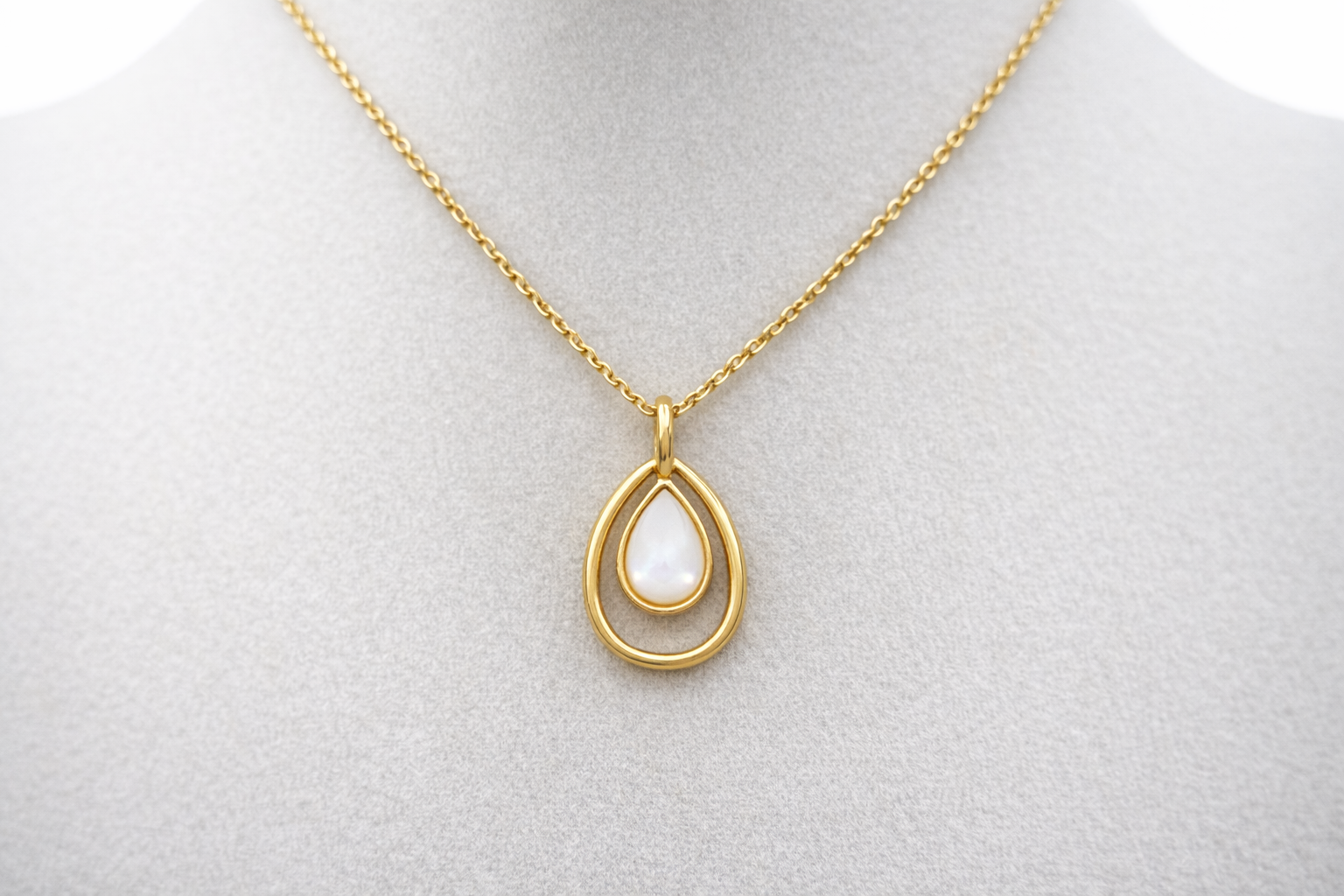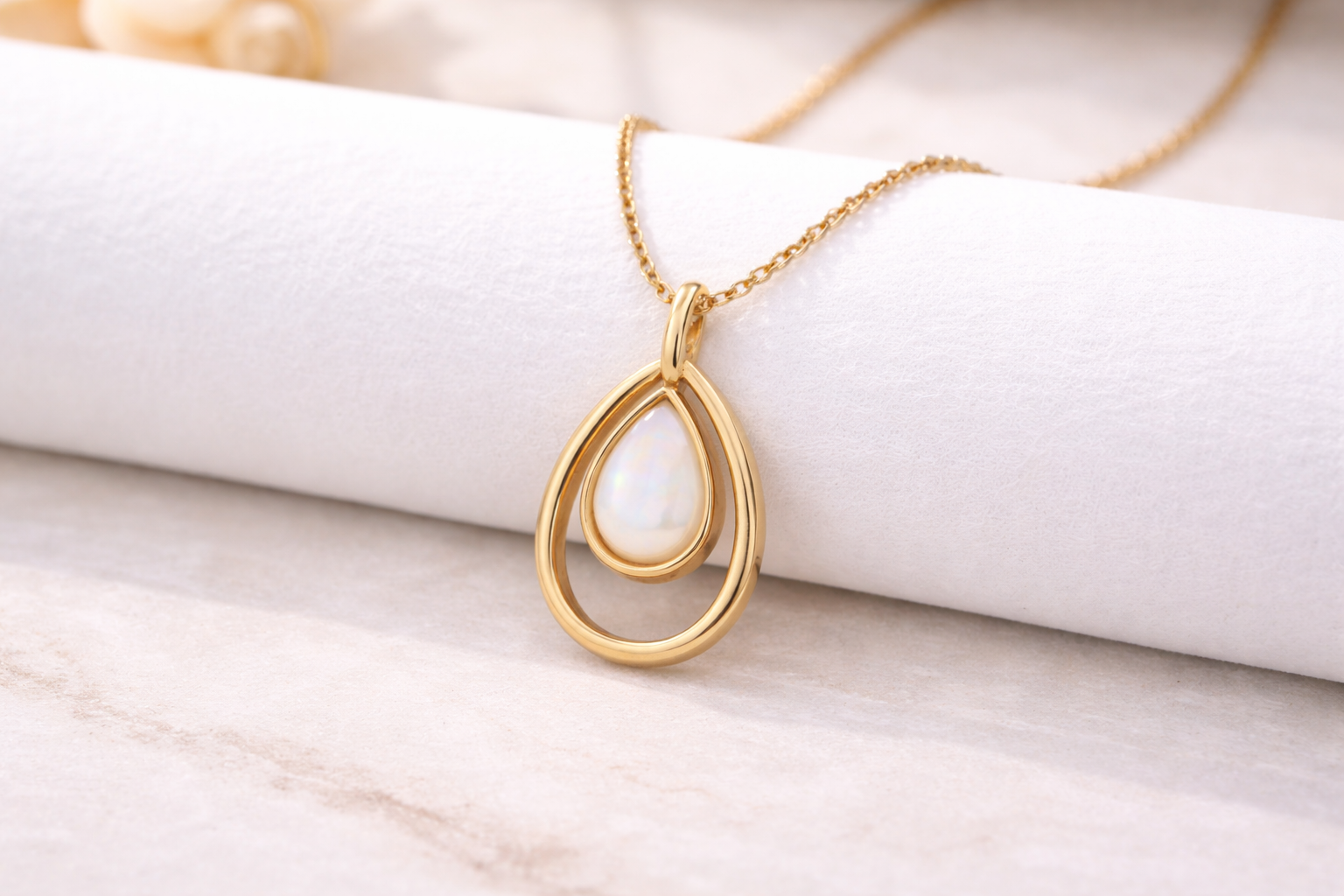 A graceful teardrop pendant featuring a luminous opal-look center framed by a sleek open-drop outline. Minimal yet romantic, it catches soft rainbow light and layers beautifully with other chains.