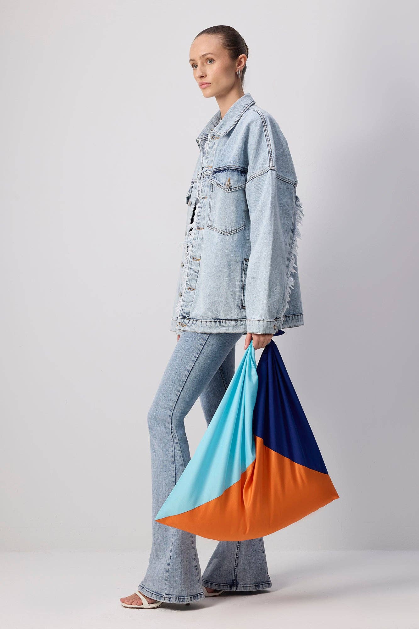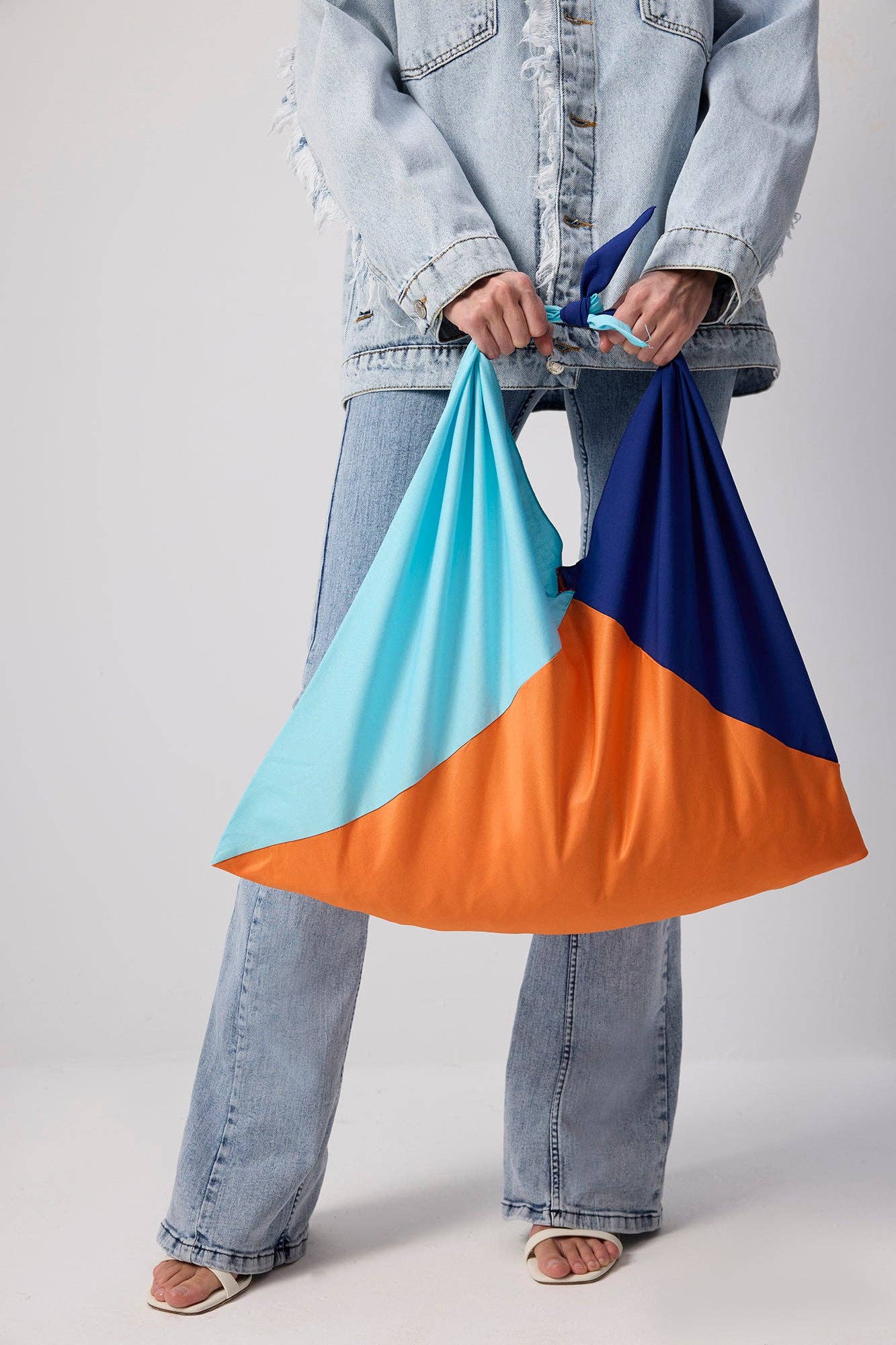 A lightweight poplin tote that makes a statement with its bold tri-tone colorblocking in vivid blue, tangerine, and aqua. Its oversized knotted shoulder design and unstructured shape make it perfect for sunny days, errands, or beach escapes.