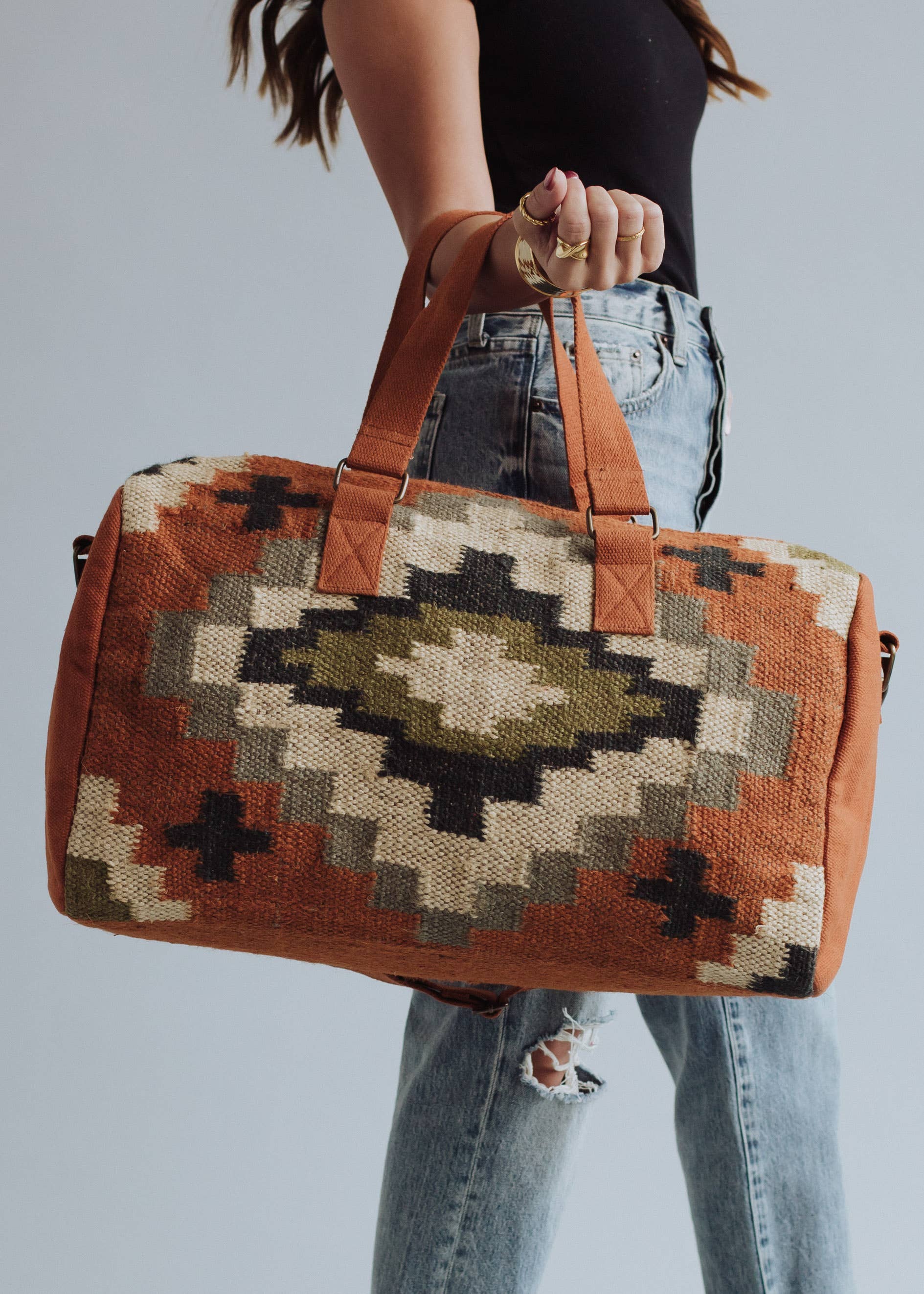 Rich, rustic tones and bold southwestern patterns make this weekender your ideal escape companion. The warm terracotta base and earthy greens feel grounded, while the spacious design and durable woven texture make it adventure-ready.
