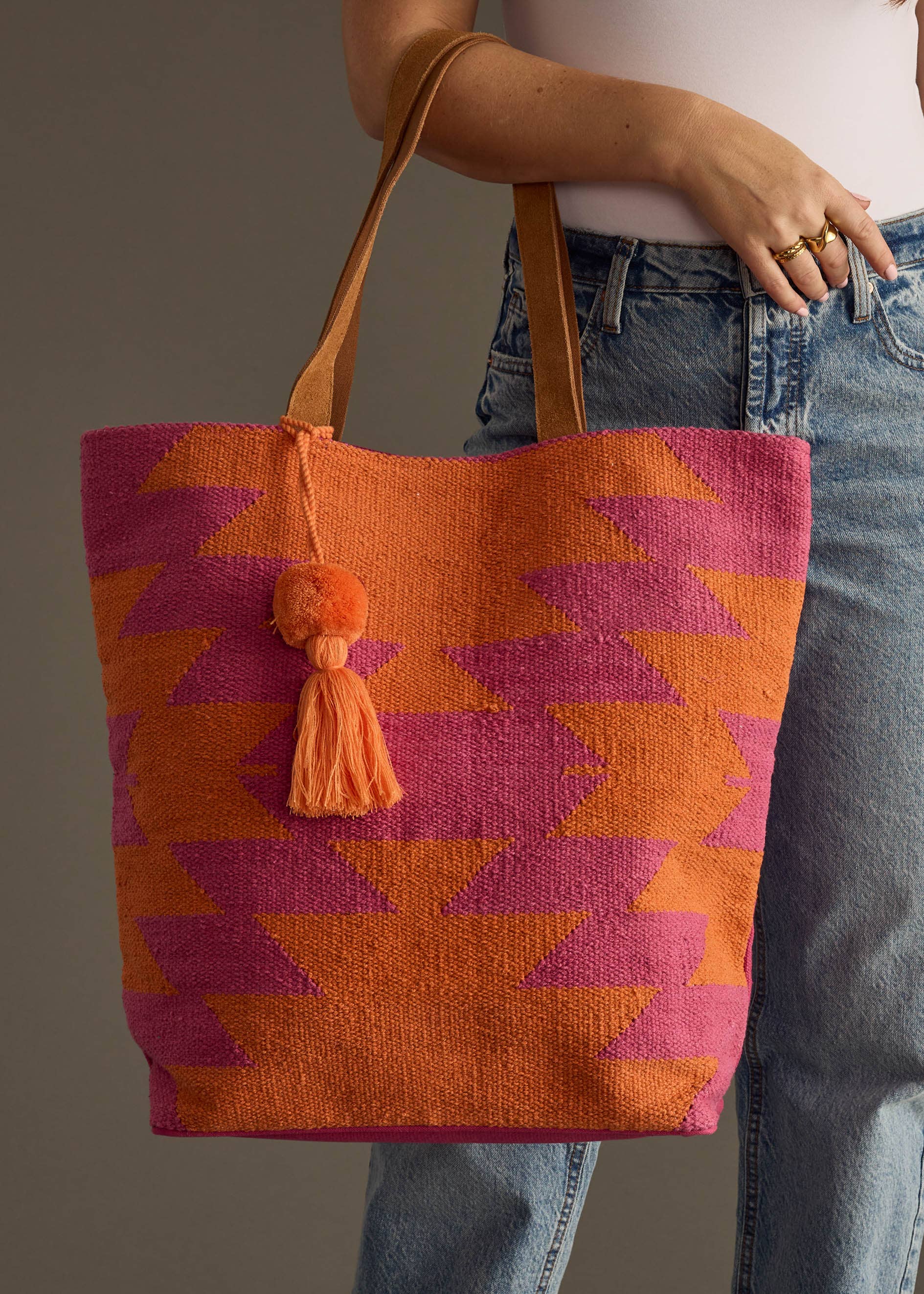 Say hello to your new favorite pop-of-color tote. With vivid pink and orange zigzags, a soft pom-pom tassel, and sturdy leather straps, this bag brings major personality to any outfit. It’s perfect for market days, beach runs, or hauling around your daily must-haves.