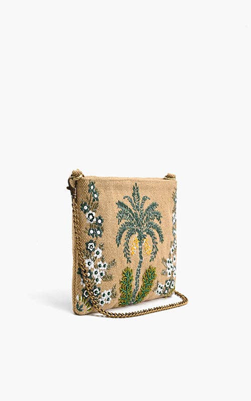 Natural and easygoing, this jute clutch features delicate beaded palm trees and wildflowers that feel like golden hour in bag form. The gold chain strap adds a polished touch to its earthy, island-inspired design.