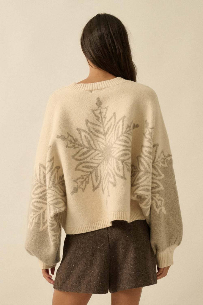 Soft, cozy, and winter-inspired, this oversized sweater features a bold snowflake motif that feels both playful and refined. The relaxed shape drapes naturally over skirts or denim, creating a warm, laid-back silhouette perfect for cold days. A seasonal favorite that never sacrifices comfort.