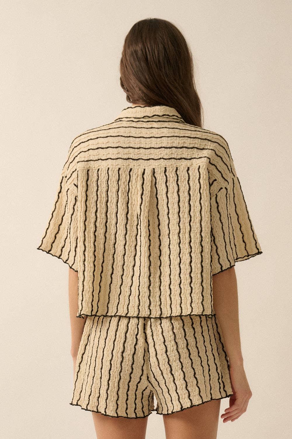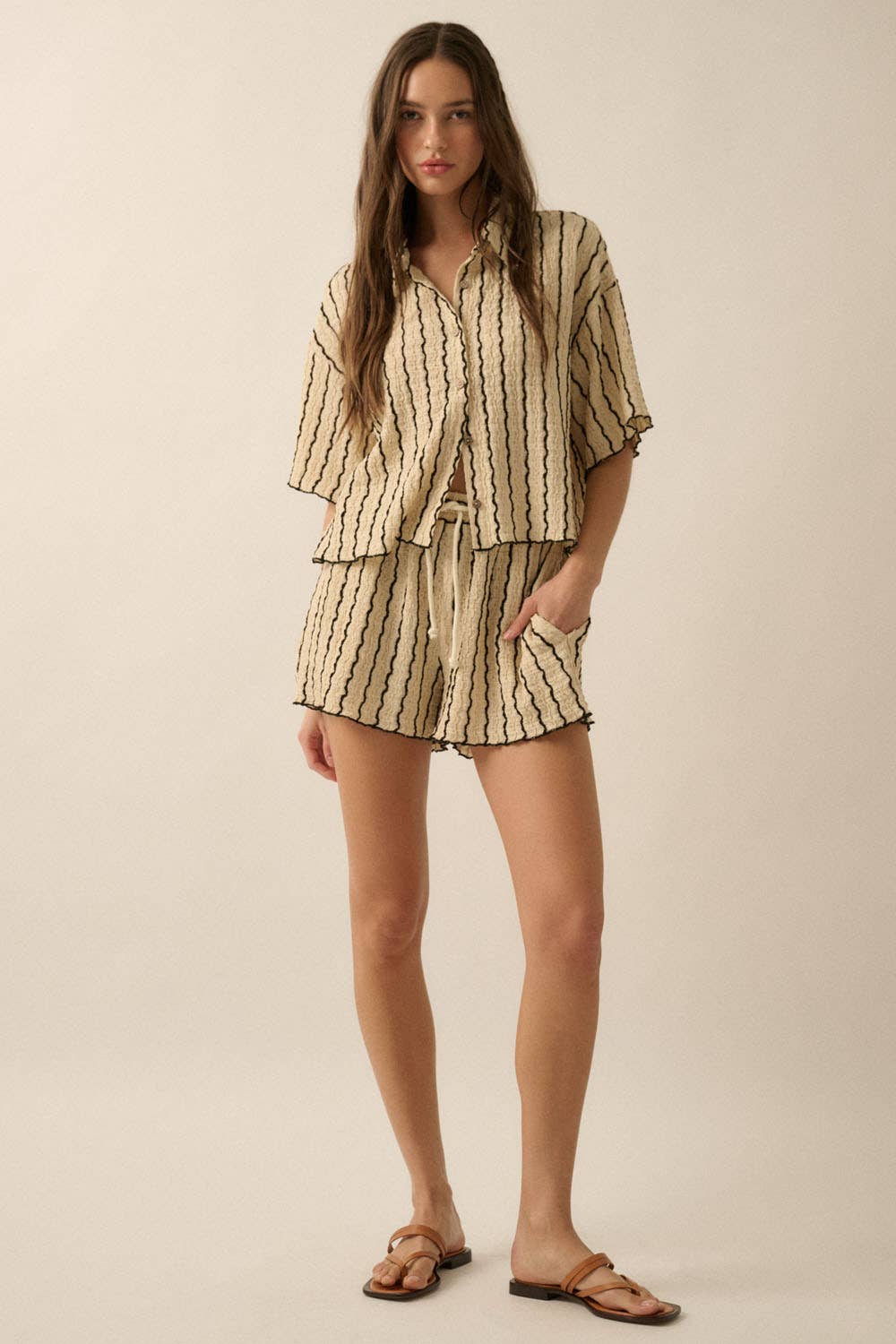 Stay effortlessly chic in this striped lounge set featuring a button-up short sleeve shirt and drawstring shorts. The textured fabric with wavy stripes adds a playful vibe, perfect for warm days or relaxed evenings.