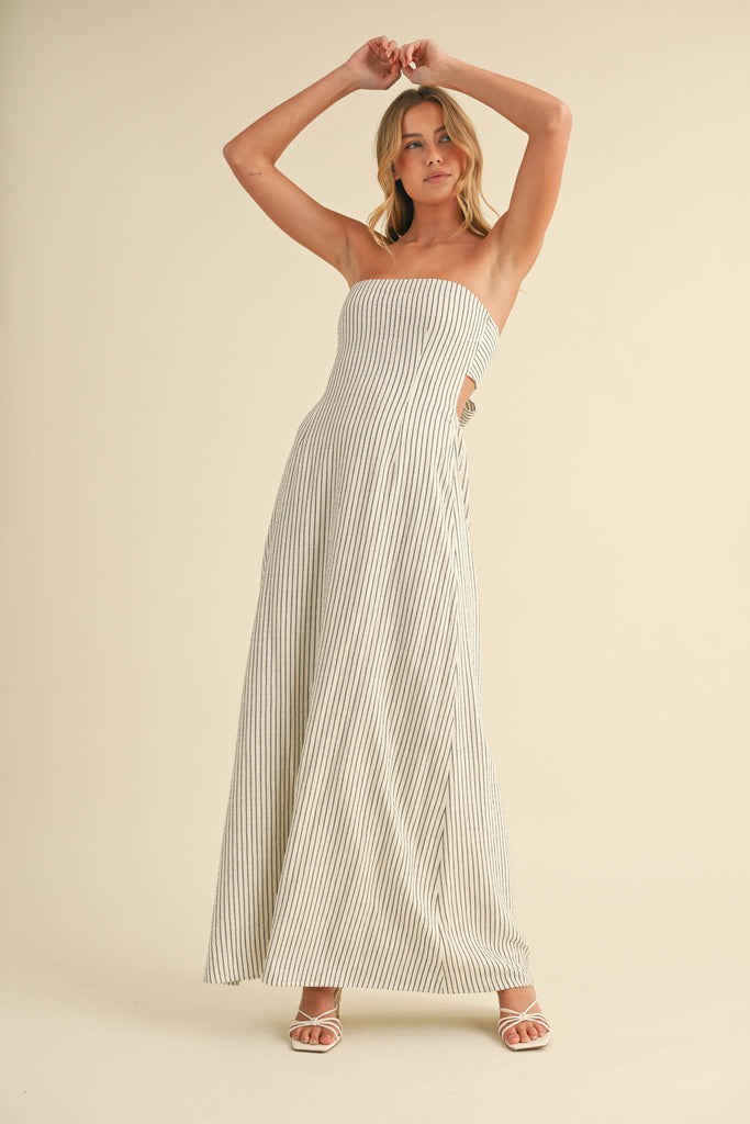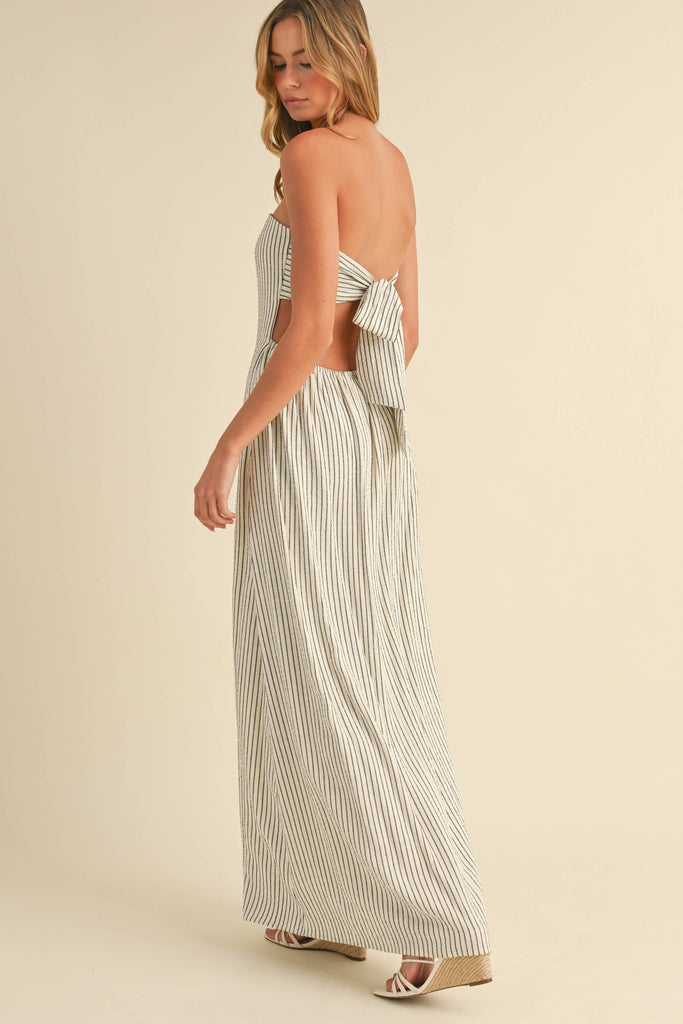 Effortlessly elegant, the Marina Stripe Back-Tie Maxi features a flattering strapless neckline and a dramatic back bow that steals the show. Its breezy, full-length silhouette and classic pinstripes make it the perfect pick for coastal escapes or sunset dinners.