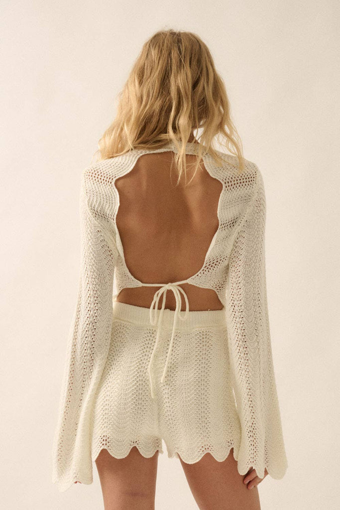 A breezy knit romper crafted in a delicate open-weave pattern with scalloped hems and bell sleeves. Lightweight yet chic, it’s the perfect blend of comfort and style for warm days and coastal nights.